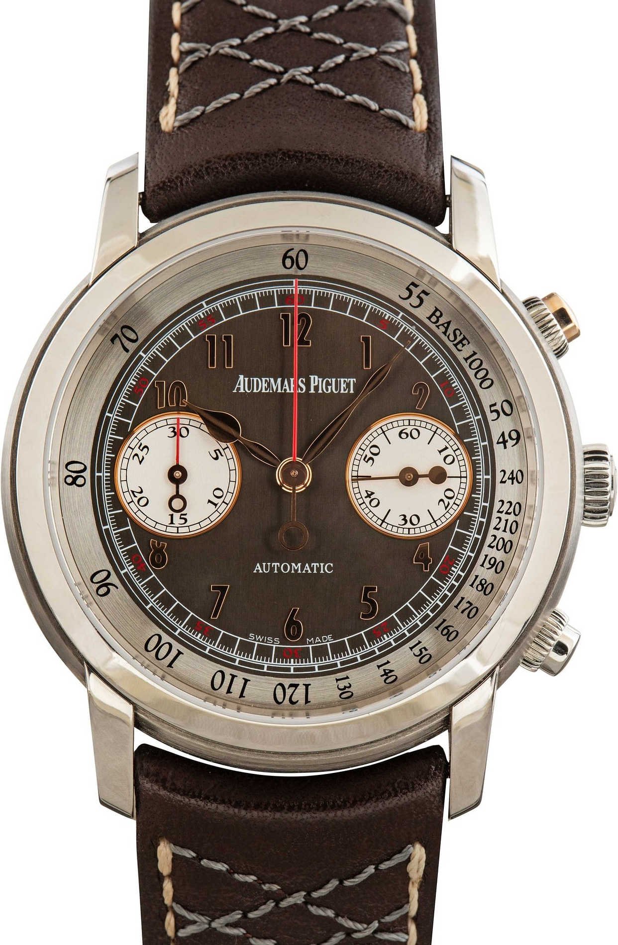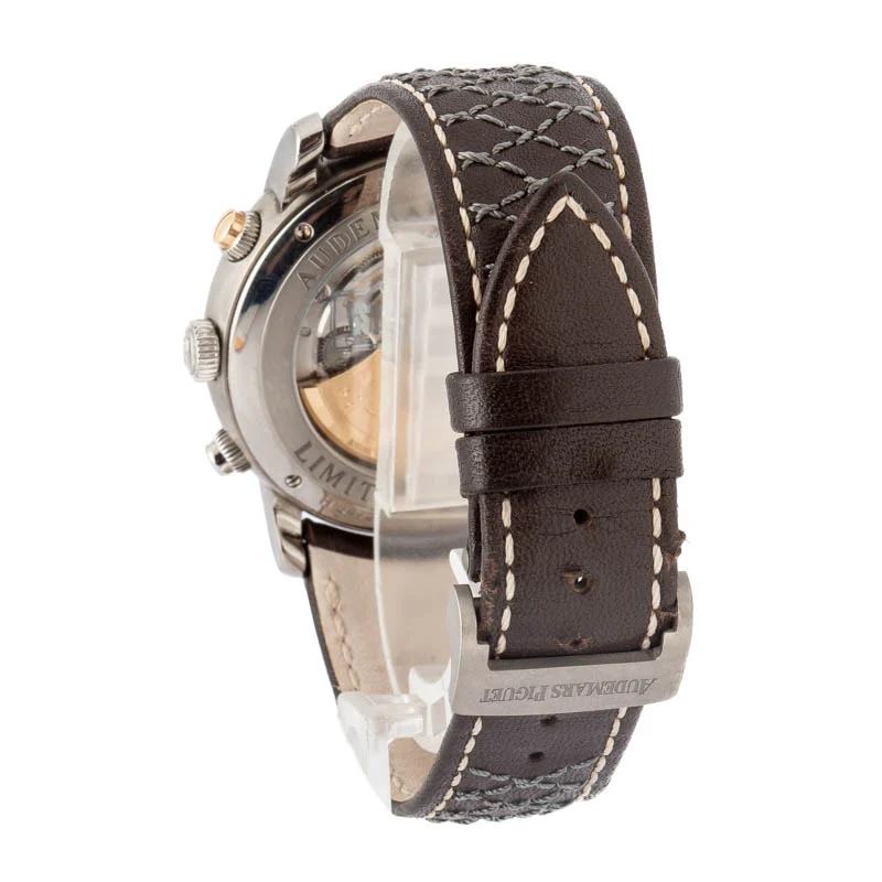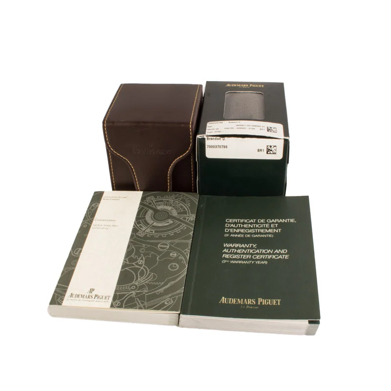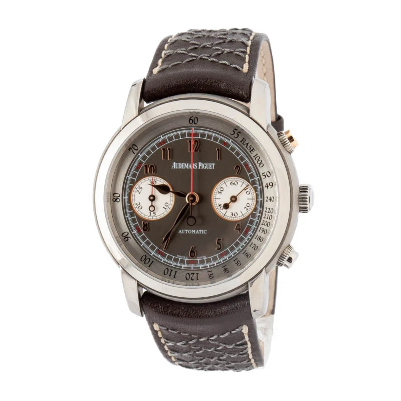 Pre-owned Audemars Piguet Jules Audemars Gstaad ref 26558TI.OO.D080VE.01 (2012) is a departure from the usual AP offerings, focusing on traditional round case design while still showcasing the brand’s technical strength. Crafted from titanium, the 41mm case feels noticeably lighter on the wrist, giving it an effortless, comfortable wear despite its size. The anthracite dial features bold Arabic numerals and a chronograph layout that adds depth without feeling overly busy, striking a balance between sport and refinement. Powered by the self-winding caliber 3124 / 3841, the watch delivers the reliability and finishing standards Audemars Piguet is known for. Paired with a leather strap, the overall presentation feels more understated than AP’s integrated bracelet models, making it a great option for someone who appreciates the brand’s watchmaking pedigree but prefers a more classic aesthetic. It’s a less common reference that reflects AP’s versatility beyond its most famous designs.