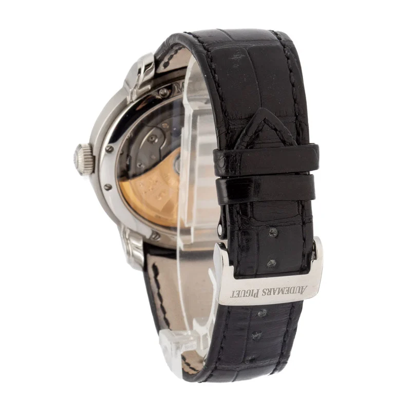 Pre-owned Audemars Piguet Millenary ref 15350ST.OO.D002CR.01 (2013 – 2015) has one of the brand’s most distinctive designs, where haute horlogerie meets contemporary art. Introduced in the 1990s and refined through models like the 15350ST, the Millenary collection broke away from AP’s angular Royal Oak tradition with its elliptical case and off-centered dial layout. This 47mm stainless steel version reveals its in-house caliber 4101 right on the dial side, allowing you to admire the balance wheel in motion. The Roman numeral dial has a structural feel, blending symmetry with asymmetry in a way only AP could pull off. Flip it over, and the caseback view is just as mesmerizing. Lastly, this model is paired with a sophisticated black alligator strap.