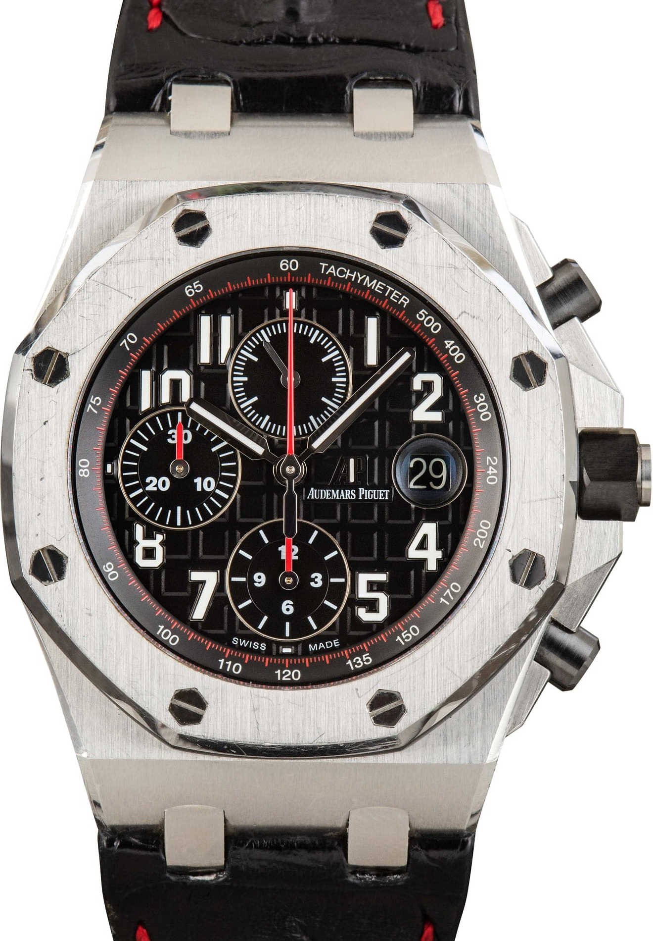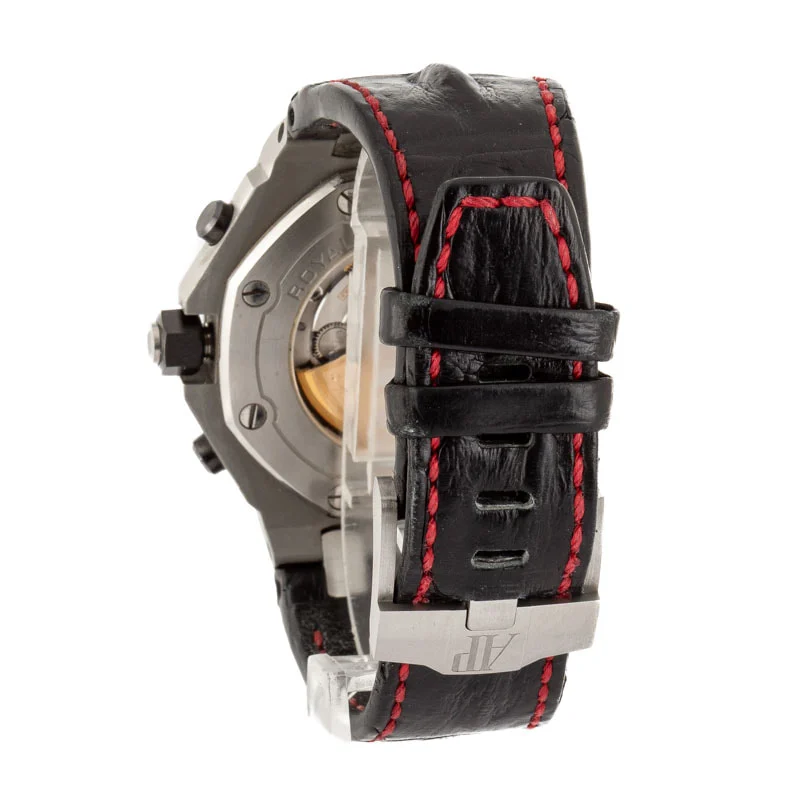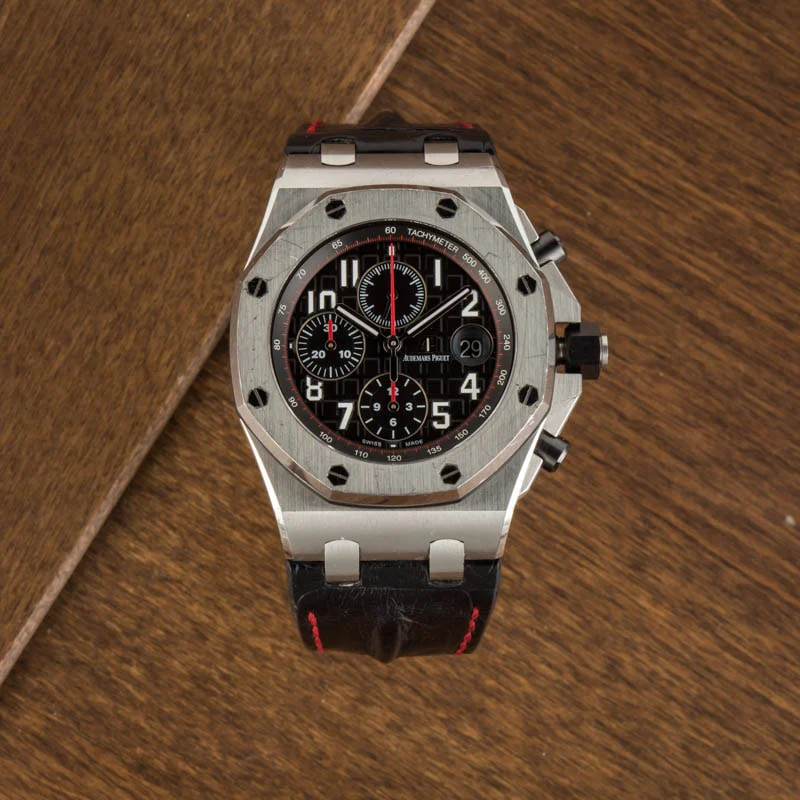 Pre-owned Audemars Piguet Royal Oak Offshore ref 26470ST.OO.A101CR.01 (2014) was part of a massive overhaul of the collection in 2014, consisting of six new models to replace the previous collection.  For the first time, the ROO had a sapphire case back, giving us a nice view of the caliber 3126 and its 22k yellow gold rotor. The collection initially consisted of four steel models, and two rose gold. The Audemars Piguet 26470ST.OO.A101CR.01 for sale here is the “Vampire” black and red stainless steel model with black ceramic pushers, a black Mega Tapisserie waffle-pattern dial with a date and vertical chronograph registers, an octagonal bezel dotted with visible screw heads, and a sleek leather strap.