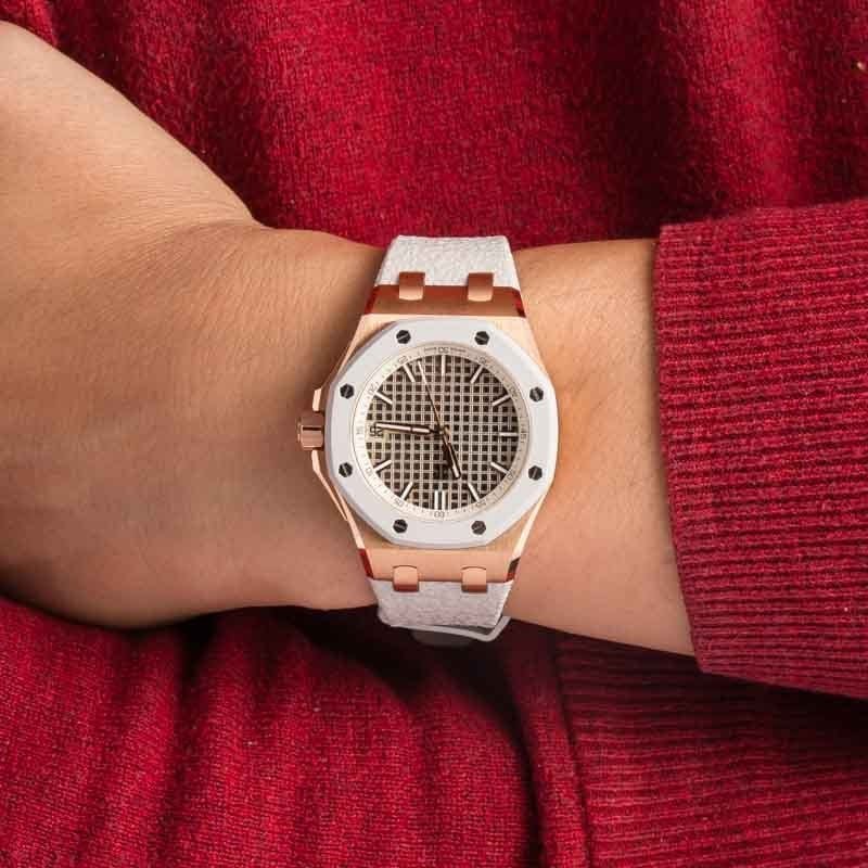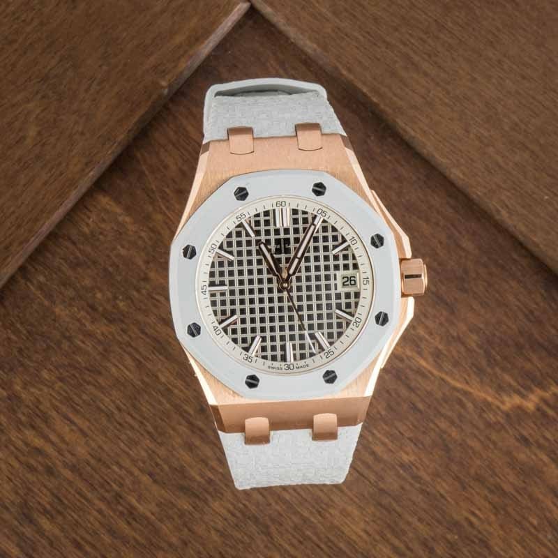 Pre-owned Audemars Piguet Royal Oak Offshore Selfwinding ref 77605OK.OO.A101CA.01 is a fresh and contemporary model released just in time for Summer 2024. In true Offshore fashion, this watch plays with different materials, featuring a 37mm 18k pink gold case topped with a grey rubber-coated bezel. The ivory dial features the signature “Grande Tapisserie” pattern, polished to a subtle sheen, with pink gold hour markers and Royal Oak hands filled with luminescent coating for legibility. The textured grey rubber strap (with a unique mosaic effect) echoes the dial’s soft tones and fastens with an 18k pink gold pin buckle. This model is powered by the self-winding caliber 5900 with a handy 60-hour power reserve.