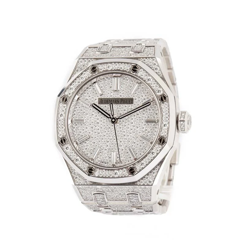 Pre-Owned Audemars Piguet Royal Oak Self-Winding ref 15552BC.ZZ.1358BC.01 dazzled collectors when it came to market in 2023, featuring a lustrous white gold finish and a completely iced-out aesthetic, also called “snow-set” by the brand. This technique is common among haute horlogerie and features hundreds of differently sized diamonds throughout, creating a dynamic, snow-like look that shimmers as the wrist moves. Visually intriguing and ultra-exclusive, this AP is the watch to wear if you want to turn heads. 13 baguette-cut diamonds serve as the hour markers, set against a white gold and diamond-encrusted dial. The rest of the watch is dripping in stones, including the faceted crown, iconic screw-set bezel, and integrated bracelet. In total, 318 diamonds adorn the case, 699 brilliant-cut and 13 banquette-cut diamonds adorn the dial, and 1,106 diamonds adorn the bracelet. That’s over 7 carats worth of diamonds. At the same time, the case is quite approachable at 37mm, balancing out the diamond-set design.