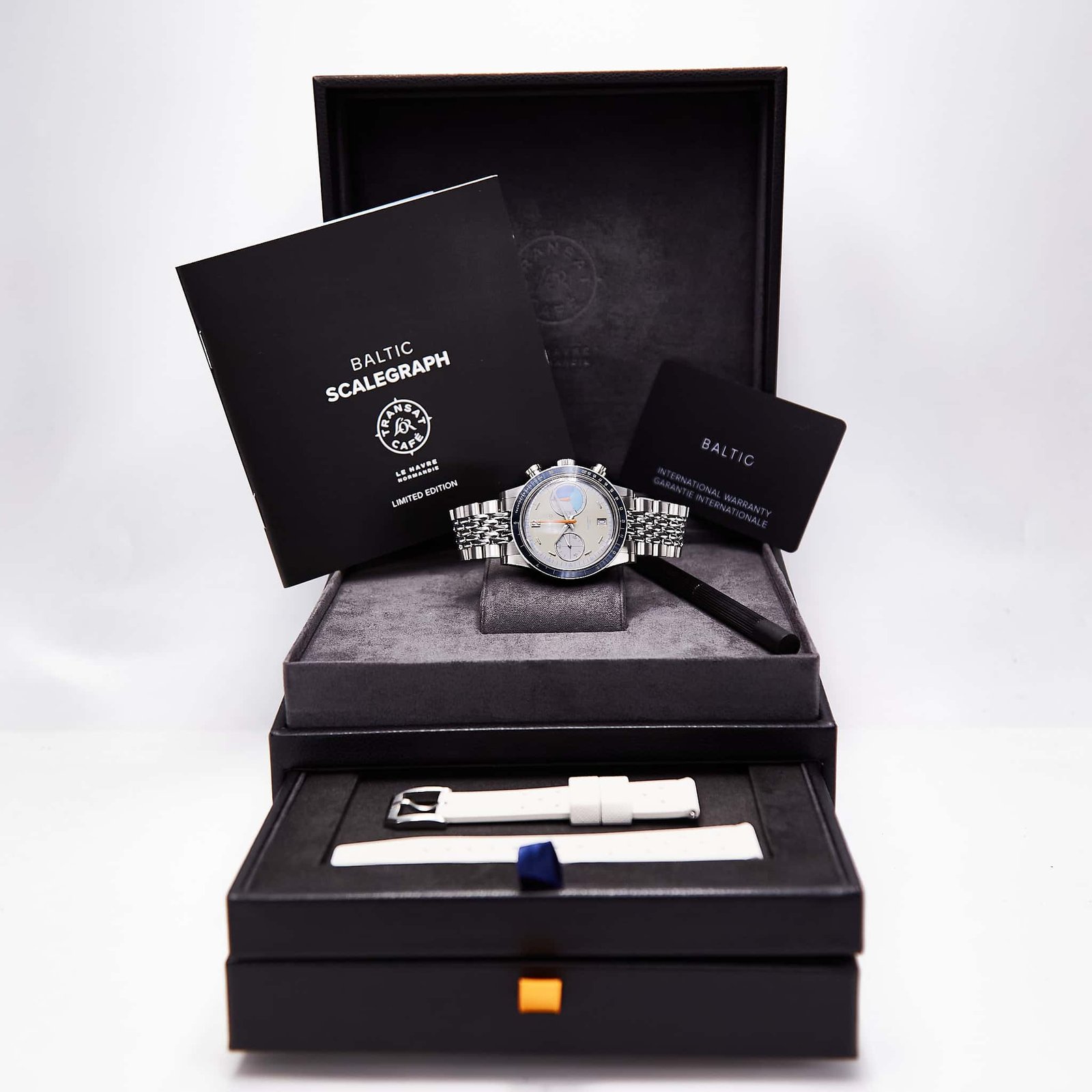 Offering a blend of their own design codes with those of sailing, this new Scalegraph draws its inspiration from offshore racing. The case features a bezel created specifically for the occasion. Graduated in knots over 1/10th nautical mile, allowing the skipper to measure the average speed a sailing boat could achieve.