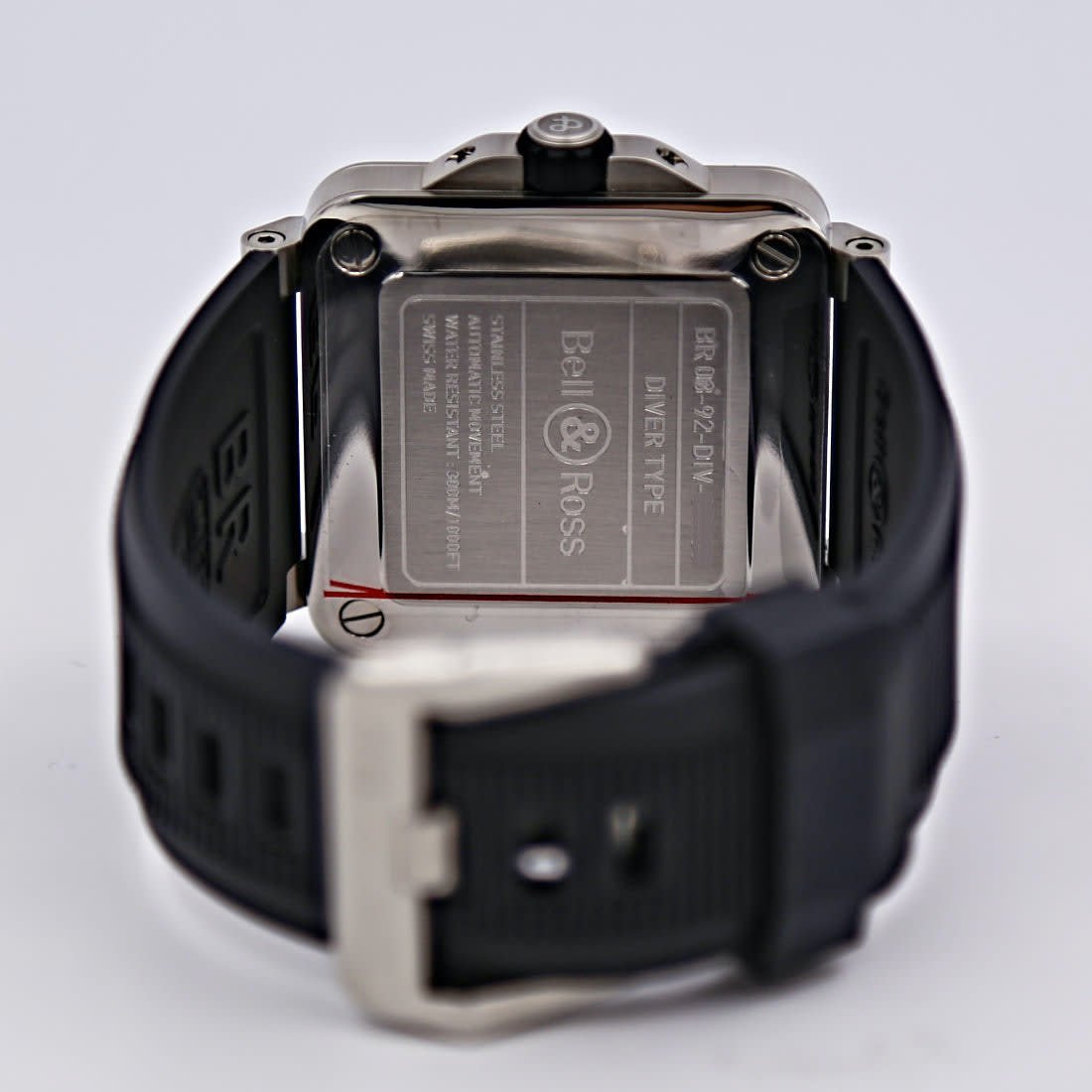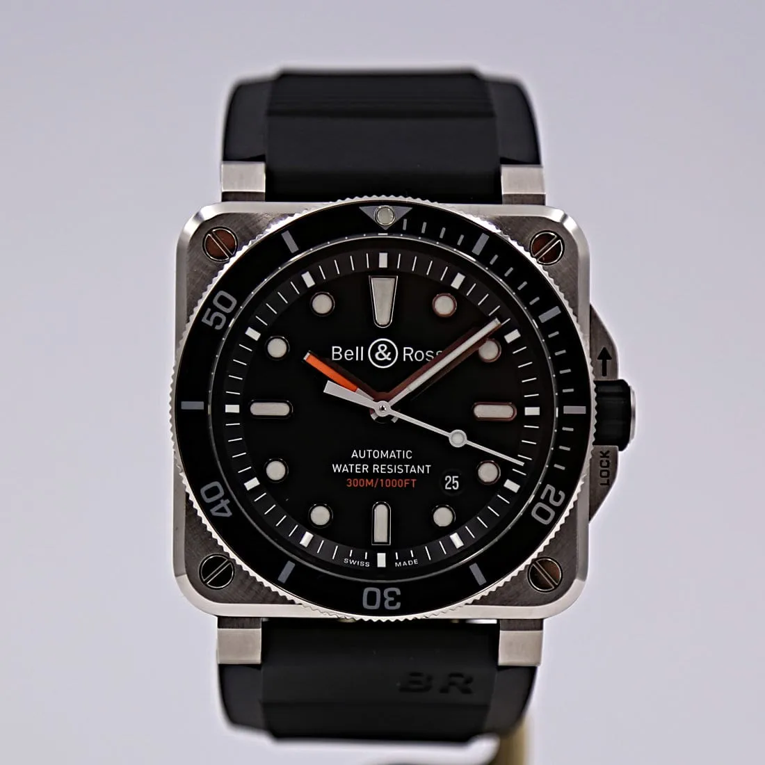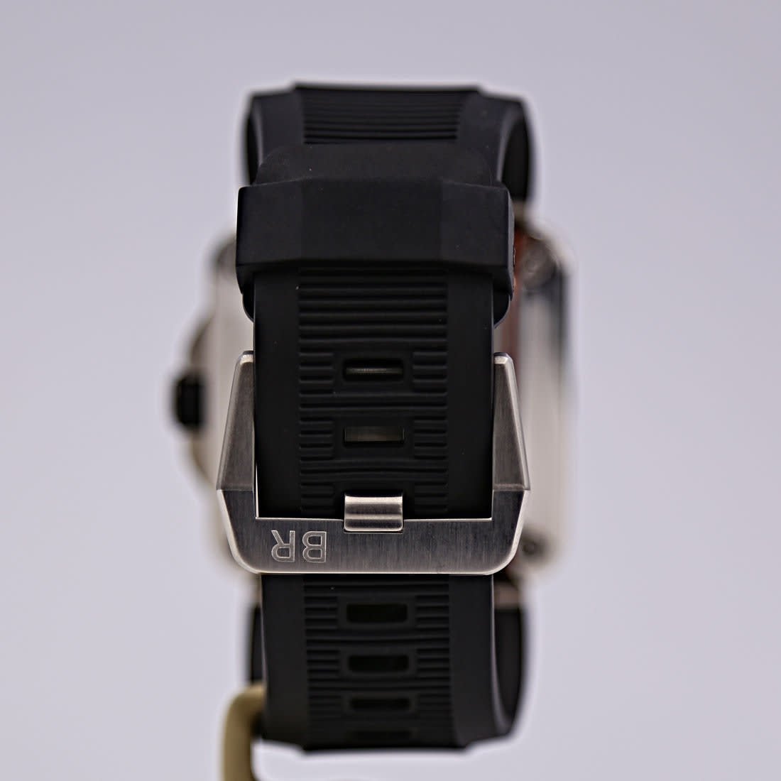 This Black Diver Automatic watch has a satin polished stainless steel case and unidirectional rotating steel bezel with 60-minute scale and black anodized aluminum insert. The watch is complimented with a black rubber and ultra-resilient black synthetic strap. The sapphire crystal covers the black dial with Superluminova hands and markers. The BR03-92 Diver adds a screw down crown and bezel. It easily meets a 30bar (300 meters) pressure test through use of the screw-down crown, extra-thick sapphire crystal and four sturdy screws that connect the thick case back. The BR03-92 Diver includes simpler and thicker lumed hour markers to meet the diver’s needs. Based on the innovative BR01 released in 2004 that evoked an airline cockpit, the BR03 retains the aviation iconic square designed for professionals in extreme environments but in a smaller 42mm square case as compared to the 46mm case of the BR01.