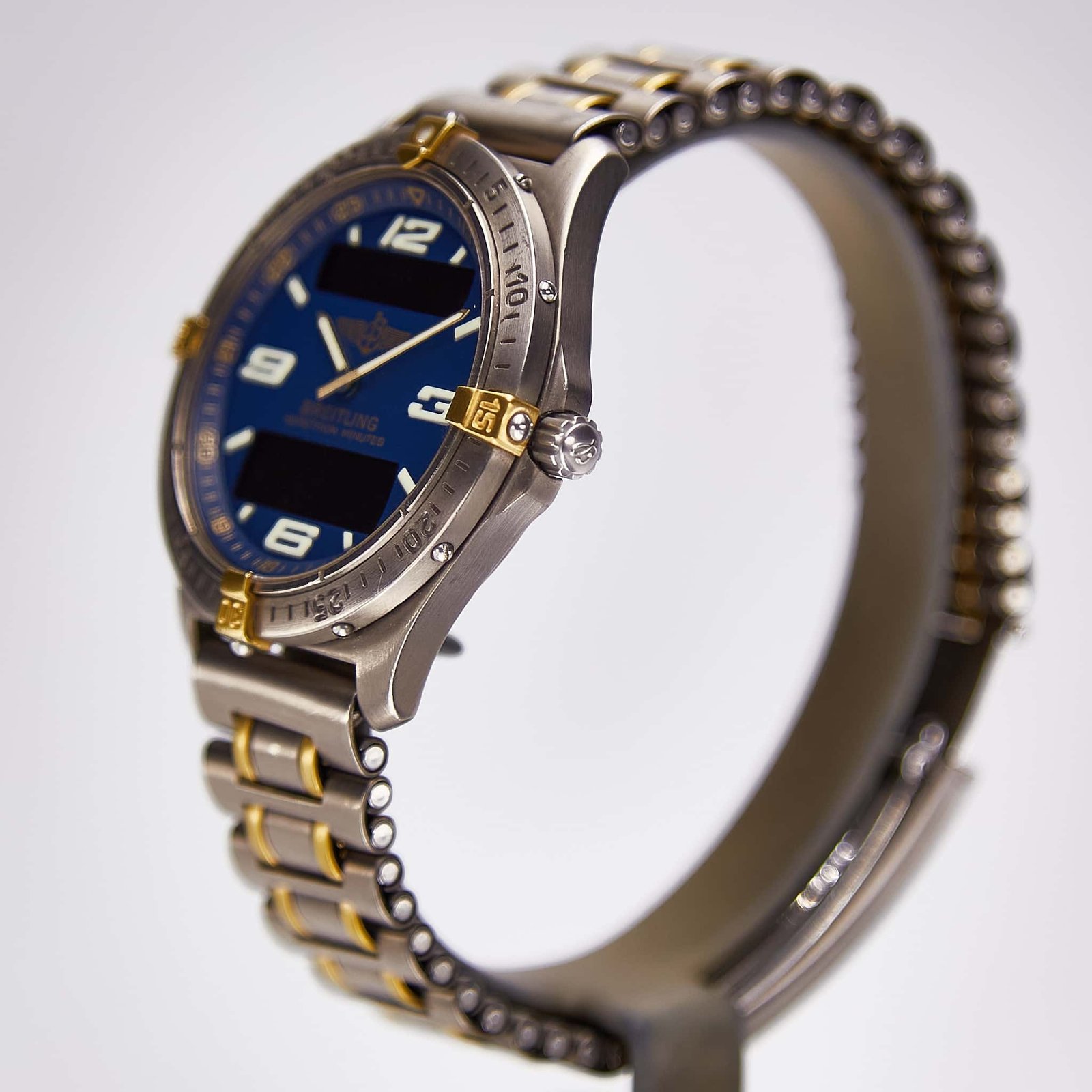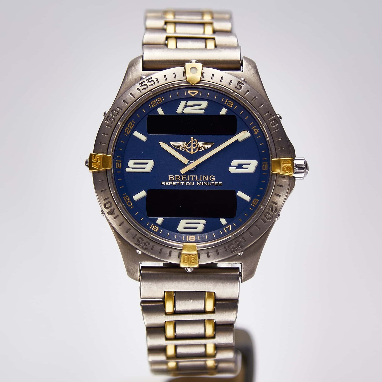 The Breitling Aerospace Ref F65062 is a masterclass in high-function utility and modern pilot style. Housed in a lightweight titanium case, this pre-owned model combines analog hands with a multi-function digital display, giving the wearer access to a suite of features like a chronograph, alarm, countdown timer, second time zone, and more, all operated via a single crown. Originally designed for aviators who needed cockpit-ready precision without the bulk, the Aerospace became an icon for its clean layout and serious functionality. With its sleek gray dial and purpose-built aesthetics, it’s a quiet flex for those who know their flight history, and their watches.