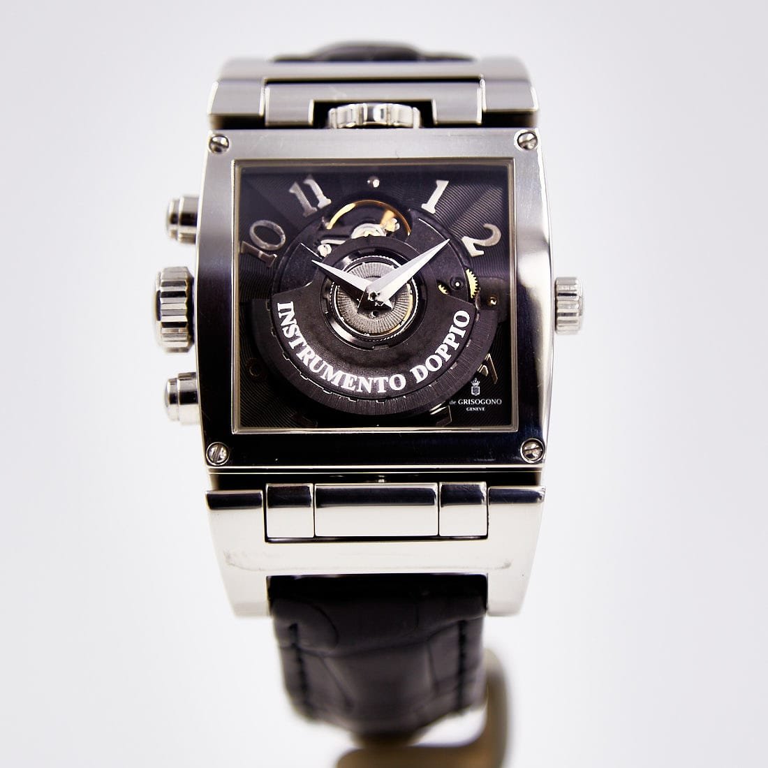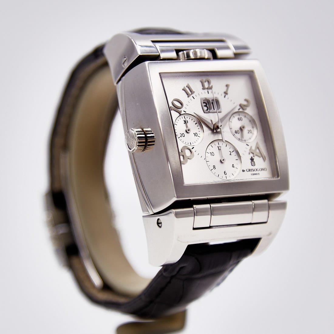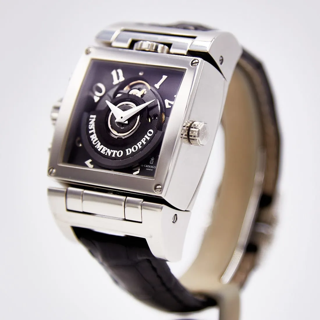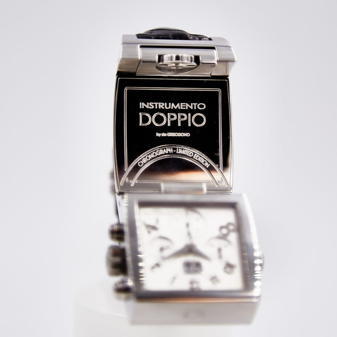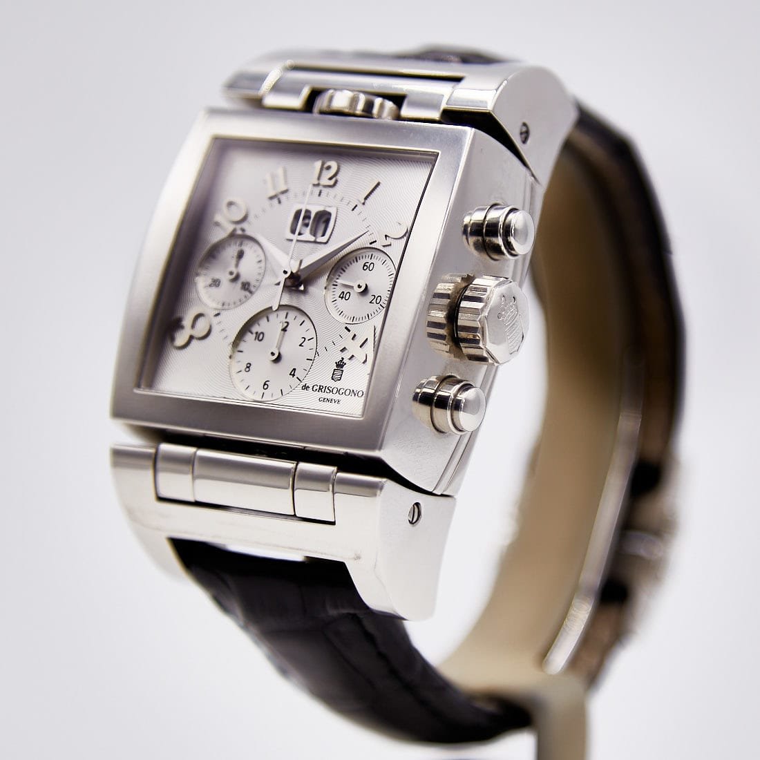 Pre-owned de Grisogono 36mm Instumento Doppio Chronograph Limited Edition, Reversing Silver and Black Dial, Leather Strap Ref CR N1