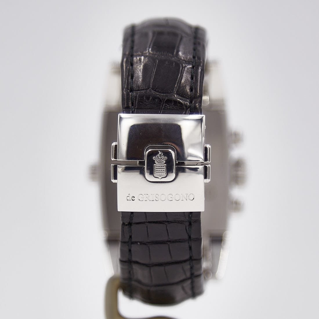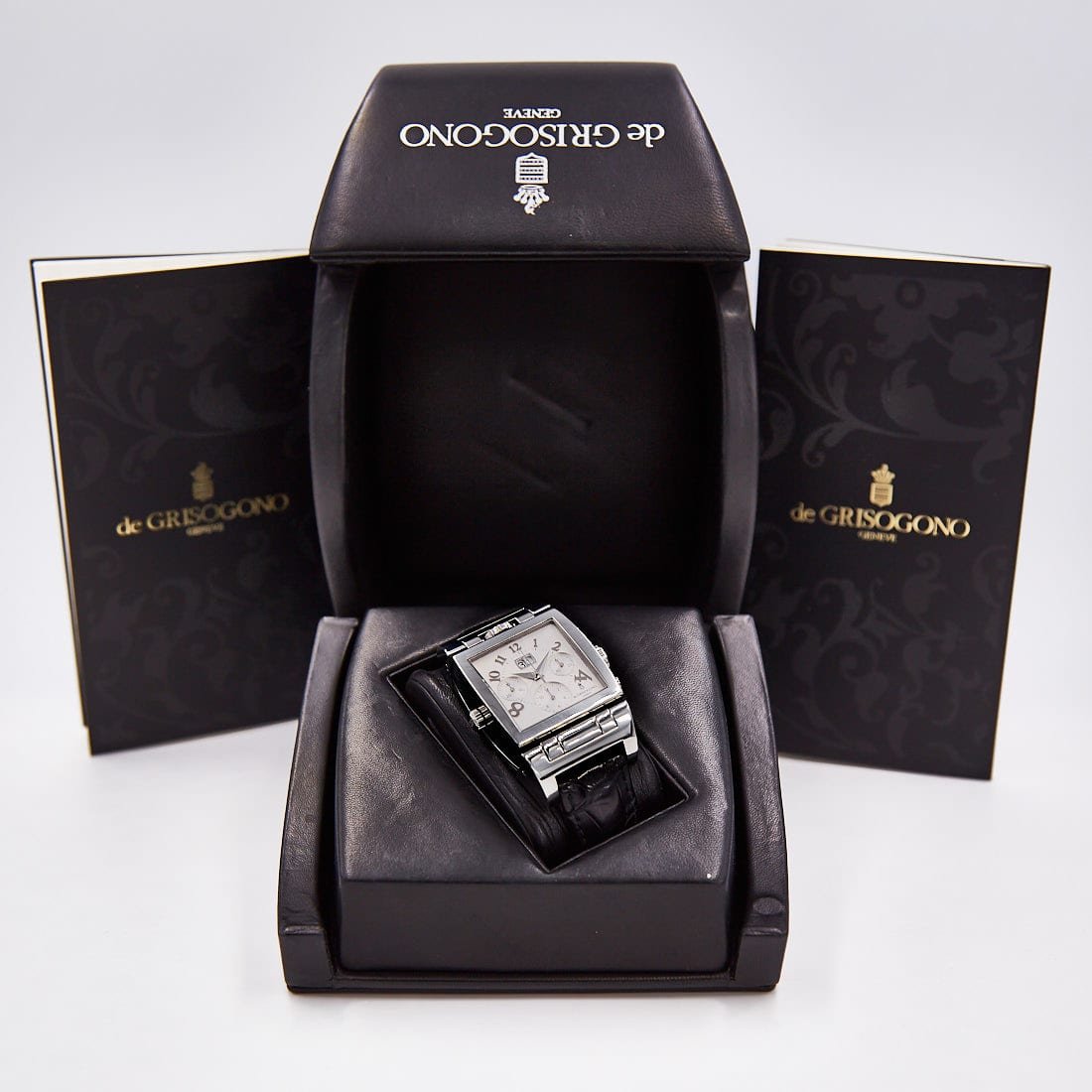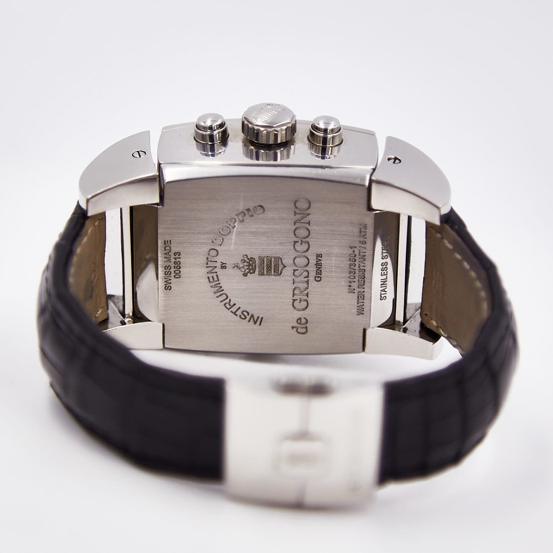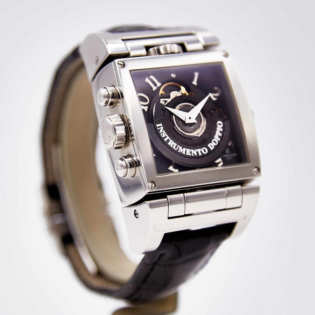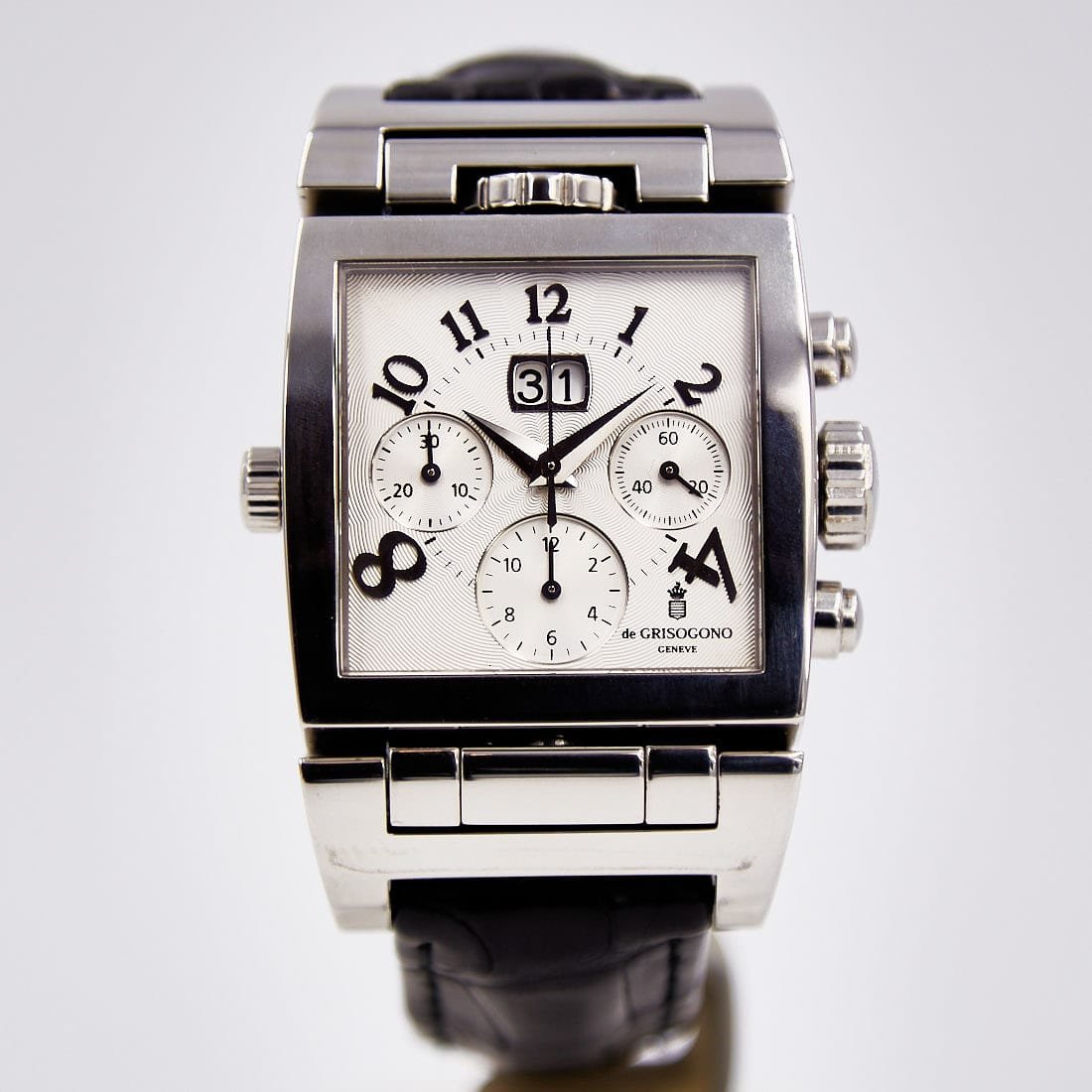 Pre-owned de Grisogono 36mm Instumento Doppio Chronograph Limited Edition, Reversing Silver and Black Dial, Leather Strap Ref CR N1
