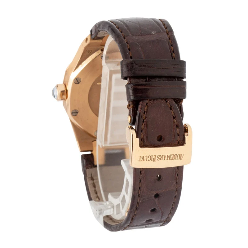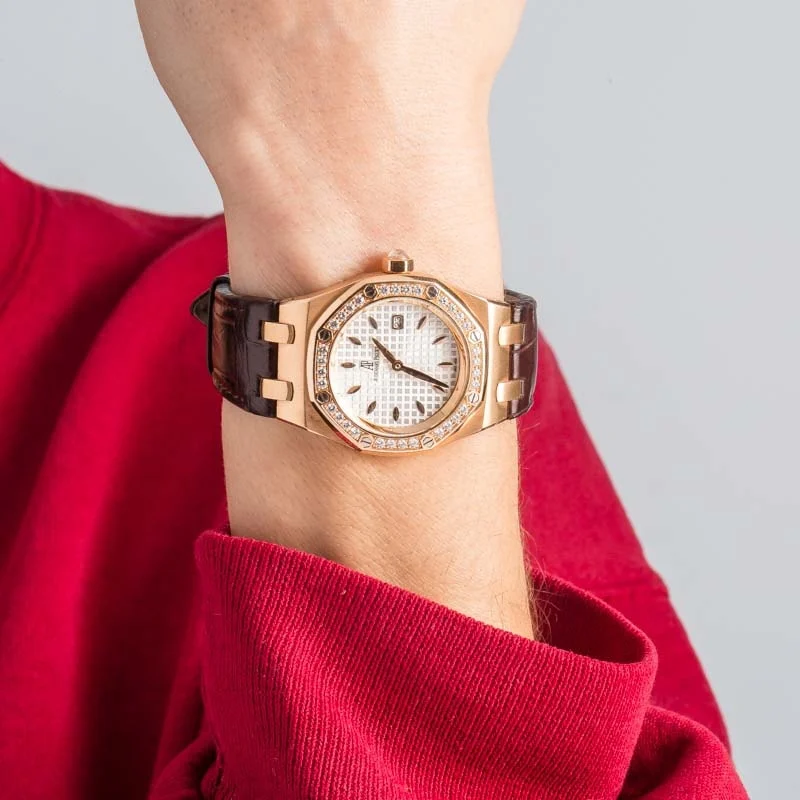 Pre-owned Audemars Piguet Royal Oak ref 67621OR.ZZ.D010CA.01. The Royal Oak is, perhaps, one of the most influential and recognizable designs in watchmaking. Developed by noted watch designer Gerald Genta in the 1970s, it introduced an entirely new category in the industry: the luxury stainless-steel sports watch. The integrated bracelet, angular case, octagonal bezel dotted with exposed screws, and waffle-pattern “Tapisserie” dial are signature aesthetics for the brand that continue to influence watchmaking, even decades later. The example you see here is a 33mm women’s Audemars Piguet. The case is furnished in lustrous red gold and features a sparkling diamond-set bezel and silver dial with leaf-shaped indices. The watch is powered by quartz and features a flattering leather strap.