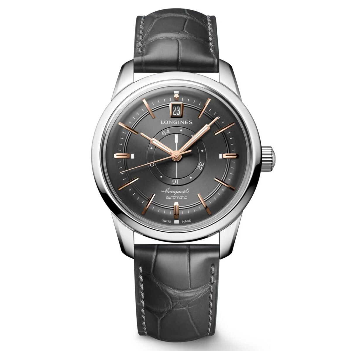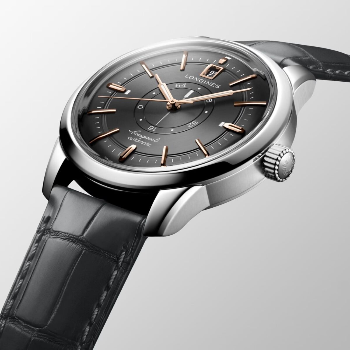 Longines is presenting the new Conquest Heritage Central Power Reserve in a 38mm diameter case. Self-winding mechanical movement, exclusive Longines caliber L896.5 with power reserve on rotating discs in the centre of the dial. An iconic model revisited in a anthracite dial paired with an integrated anthracite alligator leather strap to mark the Conquest collection’s 70th anniversary.