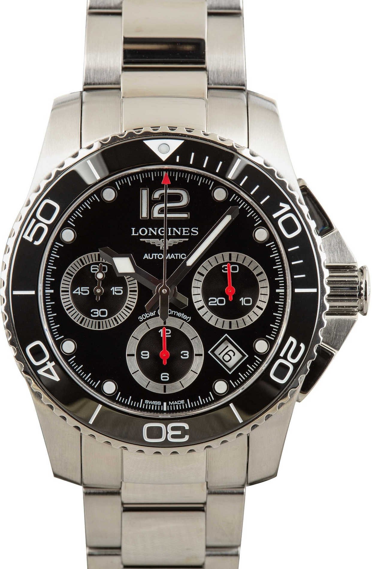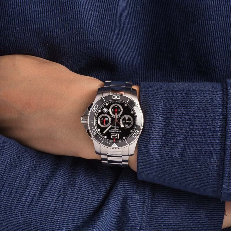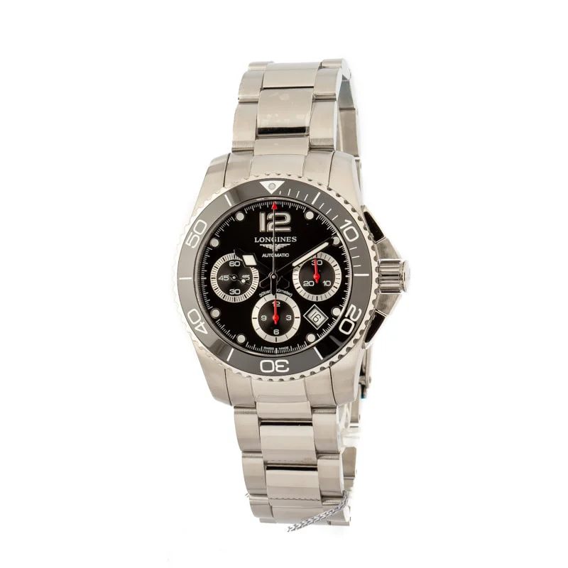 Pre-owned/unworn Longines HydroConquest ref L3.783.4.56.6 delivers the classic luxury dive watch aesthetic currently dominating the market with a sleek stainless steel finish, black dial, and matching black bezel. It wouldn’t be a proper dive watch without also including a safer unidirectional bezel and water resistance up to 300 meters/1,000 feet. Aside from being a functional dive watch, ref. L3.783.4.56.6 is also widely sought-after as a high-performance timepiece that is both sophisticated and robust. This model features 21mm lugs, durable stainless steel, scratch-resistant AR sapphire crystal, a waterproof screw-in crown, and a dial decorated with Swiss Super-LumiNova. The caliber of the L688 quartz movement is hard to work with inside the case.