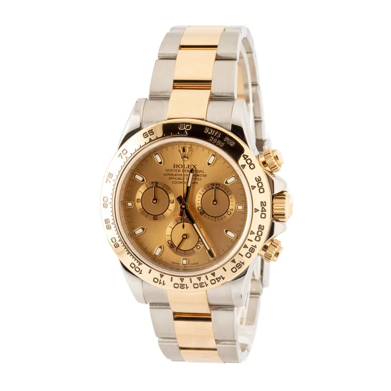 Pre-owned Rolex Daytona ref 116503 (2016 – 2023) hails from the first generation of in-house movements, caliber 4130. Previously, the Crown relied on the Zenith El Primero movement to power the Daytona. That movement was replaced by the caliber 4130 in 2000, which remained the collection’s go-to engine until 2023 when it was upgraded via caliber 4131. In true Rolex fashion, many editions of the Daytona existed back then, including the Yellow Rolesor 116503 for sale here. This model is a grail for many because it offers the prestige of gold without taking things too over the top. It’s still quite wearable and holds fast to the brand’s enduring chronograph aesthetics, from the side pushers to the fixed tachymeter scale and the matching champagne tri-compax dial. If you’re interested in getting into gold Rolex Daytona ownership, ref. 116503 is an excellent entry point.