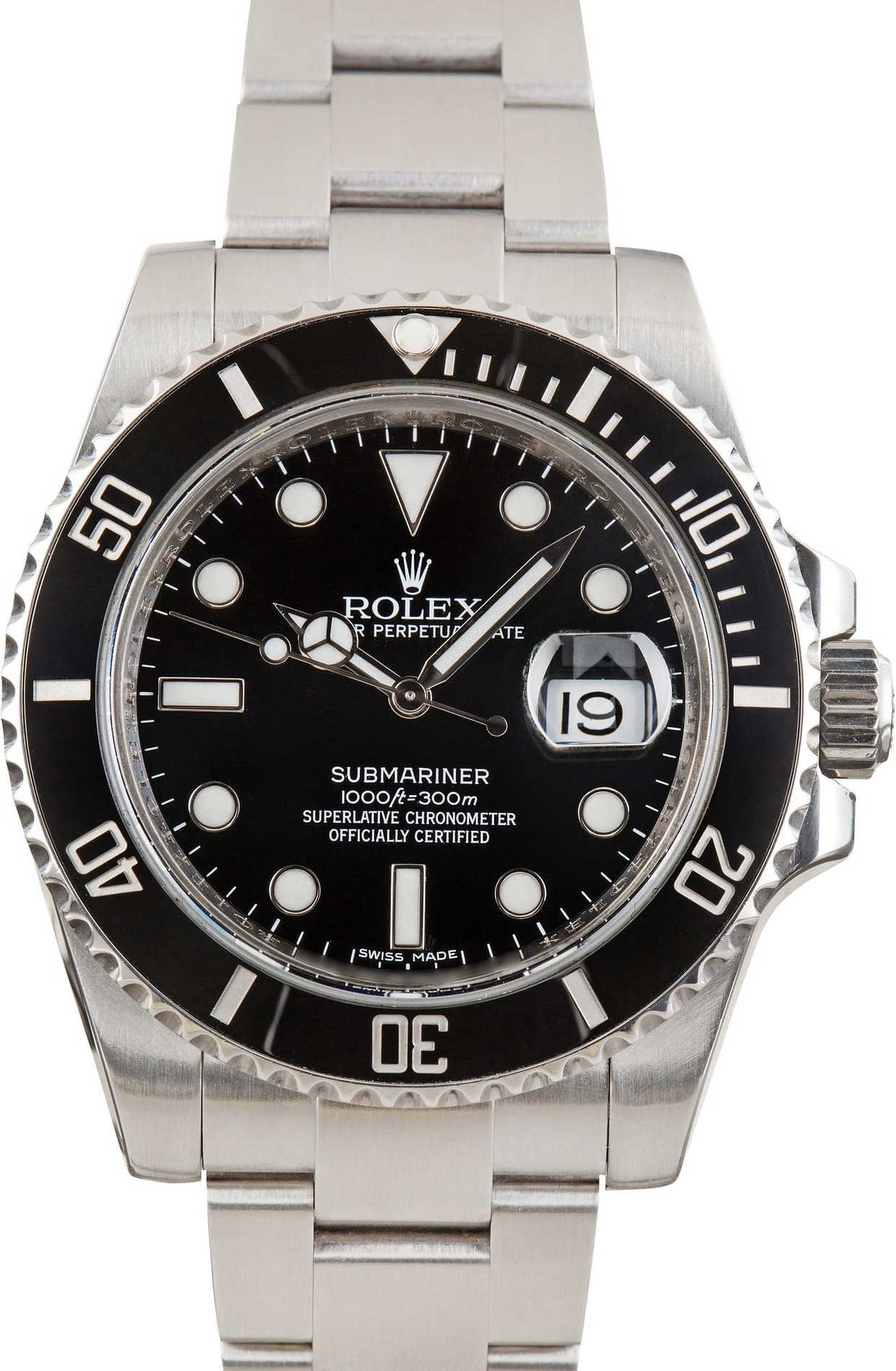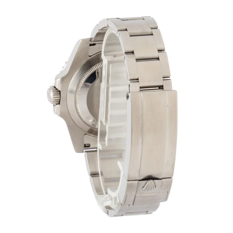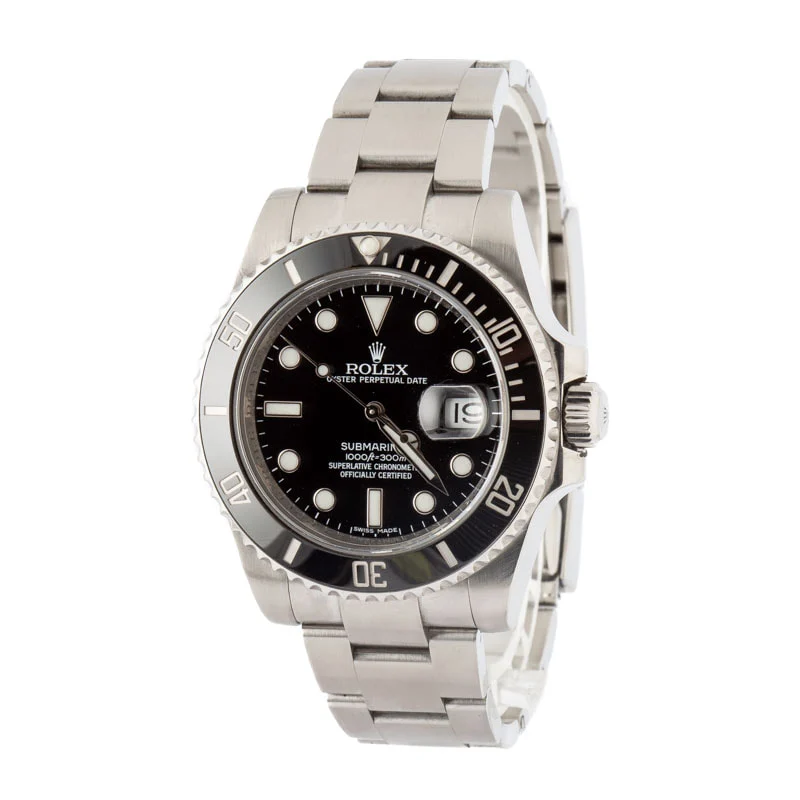 Pre-owned Rolex Submariner ref 116610 (2013) is also commonly called the “ceramic bezel Sub” because it was the first stainless steel model to sport Rolex’s patented Cerachrom. The ceramic material is significantly more resilient than aluminum and holds a much deeper luster, resulting in a watch that holds its excellent condition for much longer than aluminum. The material is also incredibly fade and corrosion-resistant – perfect for a ready-for-anything professional dive watch. Featuring a uni-directional mounting and 60-minute graduations, it also keeps perfect time while performing deep saturation dives. Additionally, the collection boasts a standard depth rating of 300 meters/1,000 feet. Models like this stainless steel Rolex are incredibly sought-after for their timeless and versatile aesthetics.