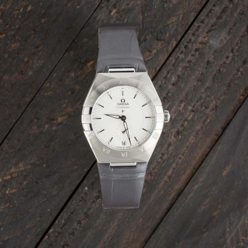 This pre-owned/unworn Omega Constellation ref. 131.13.34.20.02.001 features a 34 mm stainless steel case with signature half-moon facets and iconic “claws,” topped with a bezel engraved with Roman numerals. The crystal white silvery dial showcases a Small Seconds subdial, central minute track, and a round date window at 6 o’clock, while 18k white gold hands, hour markers, OMEGA logo, and Constellation star add refined polish. Powered by the Co‑Axial Master Chronometer Calibre 8802, it delivers exceptional precision, and paired with a grey leather strap, this elegant timepiece balances contemporary style with enduring Constellation sophistication.