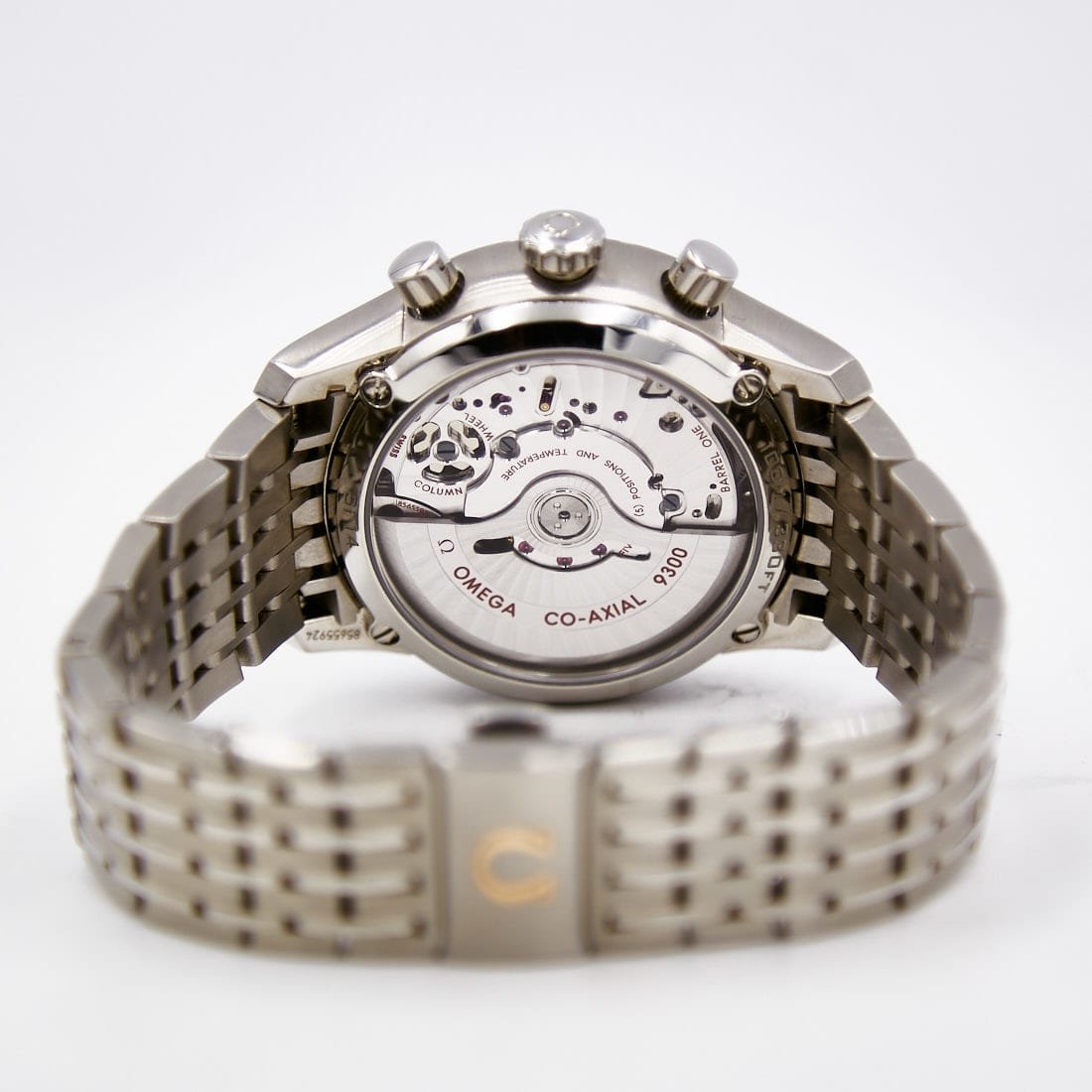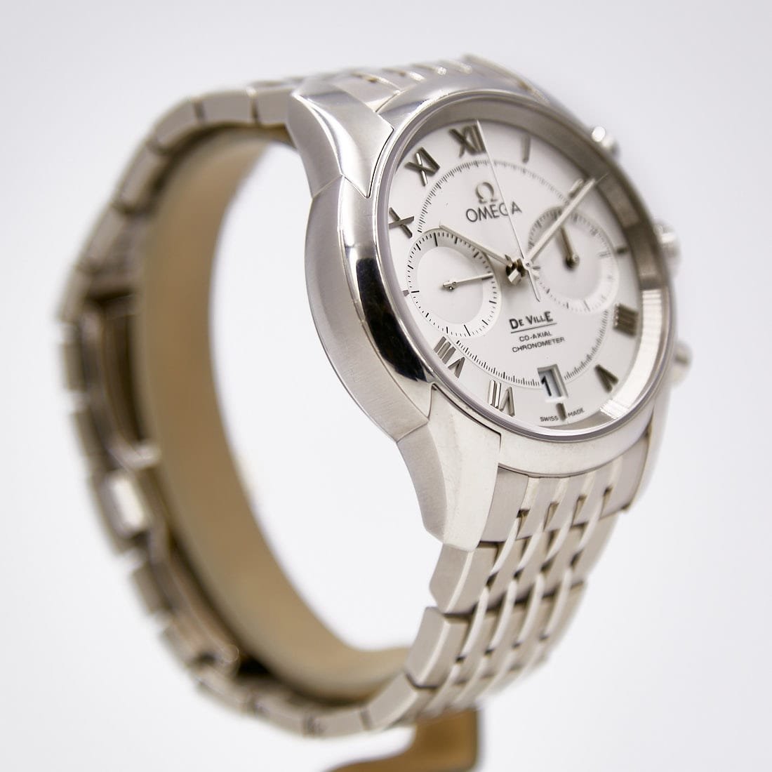 Each of Omega’s elegant De Ville timepieces is characterized by a unique and classic design. This chronograph model features a two-zone opaline silver dial with Roman numeral hour indexes, a date window at 6 o’clock and a scratch-resistant sapphire crystal. The dial presents a small seconds subdial, as well as 60-minute and 12-hour counters on one dial for intuitive reading of elapsed time. The bezel is mounted on a 42 mm stainless steel case and is presented on a stainless steel bracelet. Powering this watch is the Omega Co-Axial caliber 9300, visible through the transparent caseback.