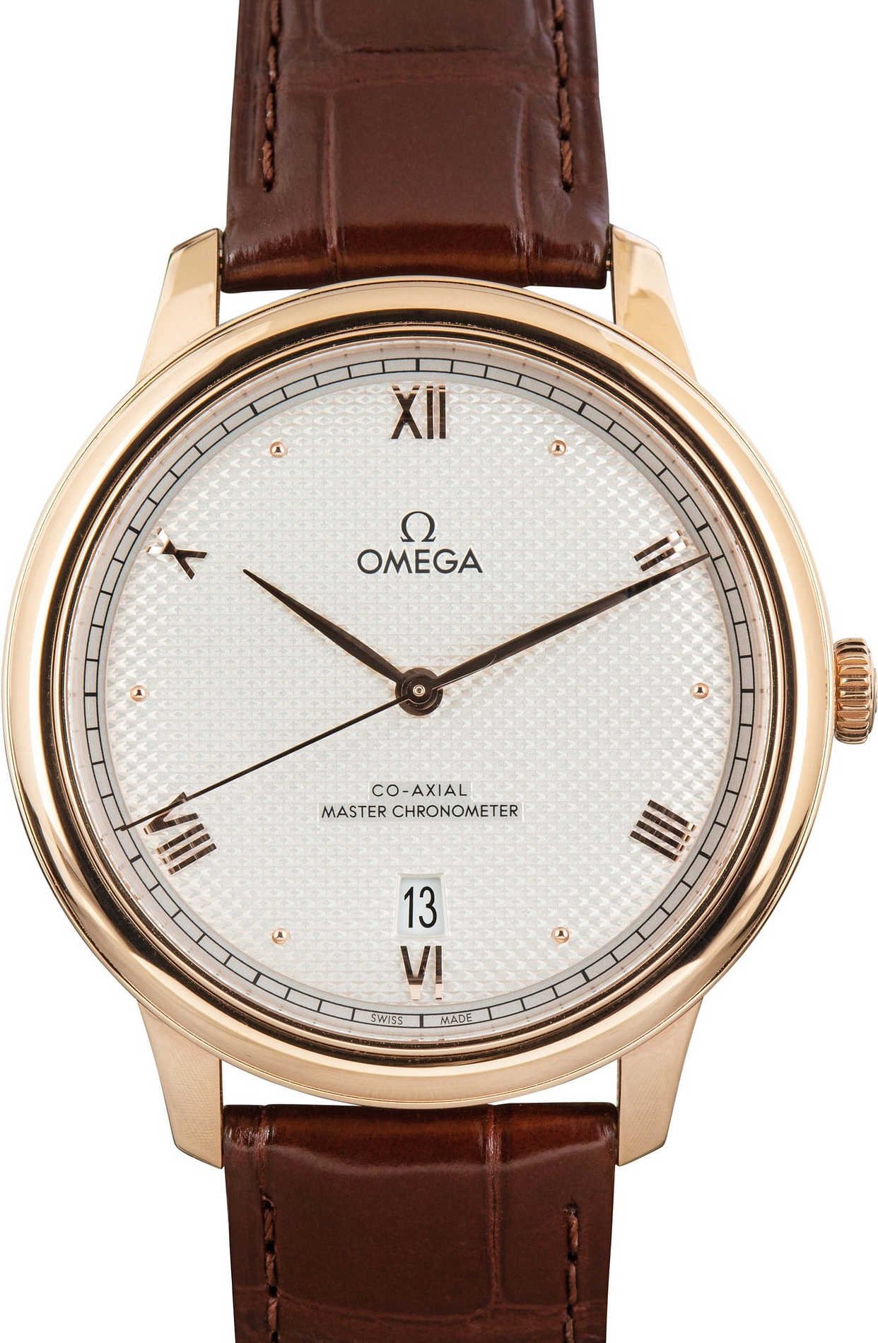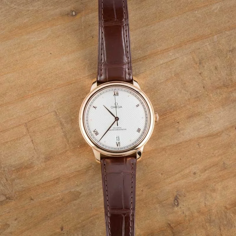 Pre-owned Omega De Ville ref 434.53.40.20.02.001 (2024) is a third-generation model, complete with the caliber 8800 Co-Axial movement, a 40mm 18K Sedna™ Gold case, and a dynamic silver dial with a stamped “clous-de-Bienne” pattern. It’s unique yet classically elegant, elements many discerning collectors consider when choosing their next luxury watch investment. The delicate texture of the dial is complemented by petite PVD Sedna™ Gold Roman numerals and cabochon indices and matching sweeping hands. The date is presented neatly above the 6-hour marker. This exquisite Omega boasts moderate water resistance up to 100 feet and houses a reliable self-winding mechanical movement, making it the perfect special occasion watch or fashion-forward daily driver.