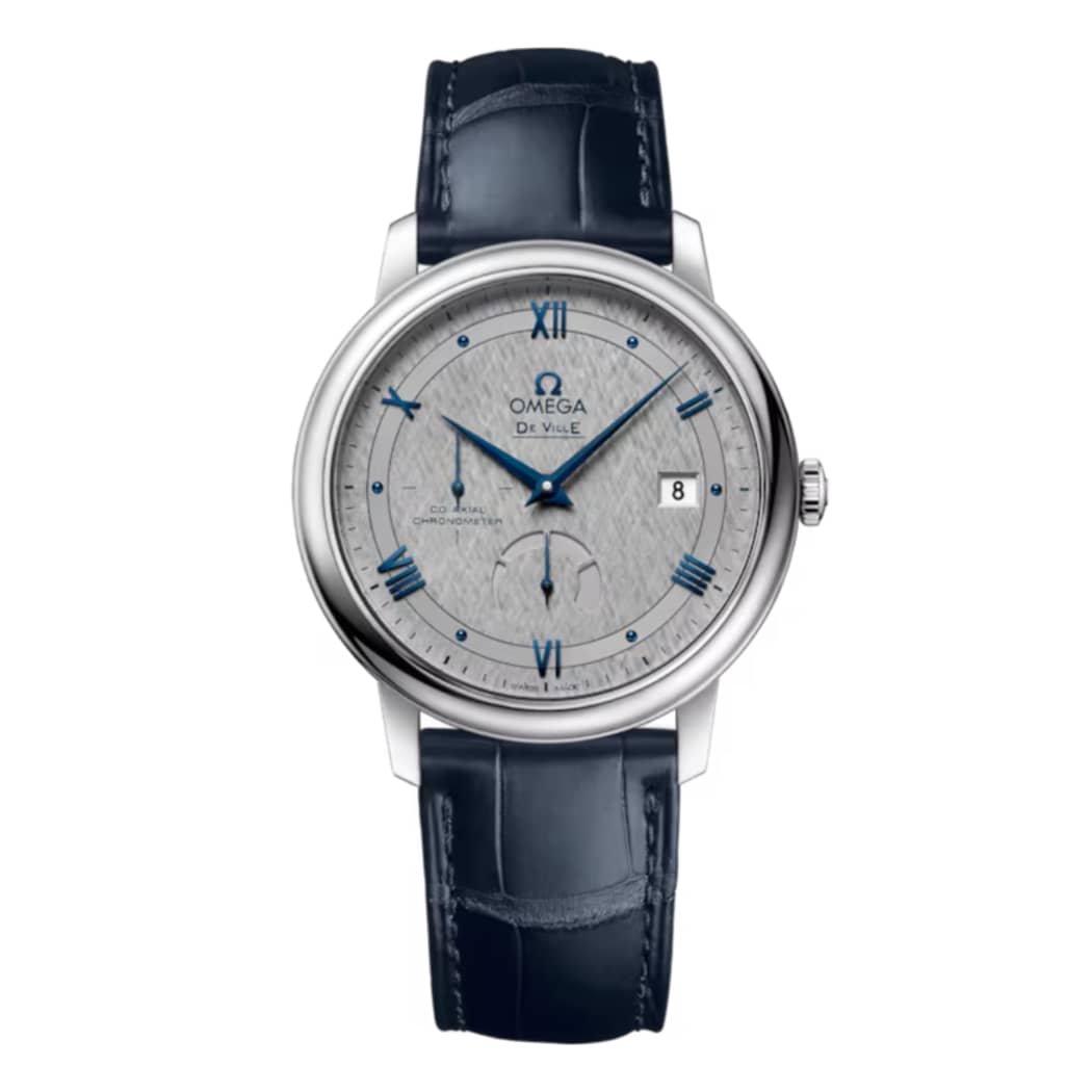 This model features a grey dial with a silk-like pattern and an opaline finish. The hands are blued and the hour-markers include six blued cabochons as well as blued Roman numerals. There is a date window at 3 o’clock and separate displays for the small-seconds at 9 o’clock and the power reserve at 6 o’clock. The 39.5 mm case is stainless steel and is presented on a blue crocodile strap. The watch is powered by Omega’s Co-Axial caliber 2627. The Omega De Ville line first appeared as dress versions of the sportier Seamaster but soon became an independent collection known for classic, elegant and interesting design innovations. The De Ville collection allows the luxury watchmaker to fully develop watches of exceptional beauty and design. Because Omega is known for accurate and reliable sport watches, they supplied the De Ville with one of the world’s most advanced movements, the exceptional co-axial developed by Dr. George Daniels. The Deville Prestige is a subset within the larger collection that continues to explore classic and elegant design.