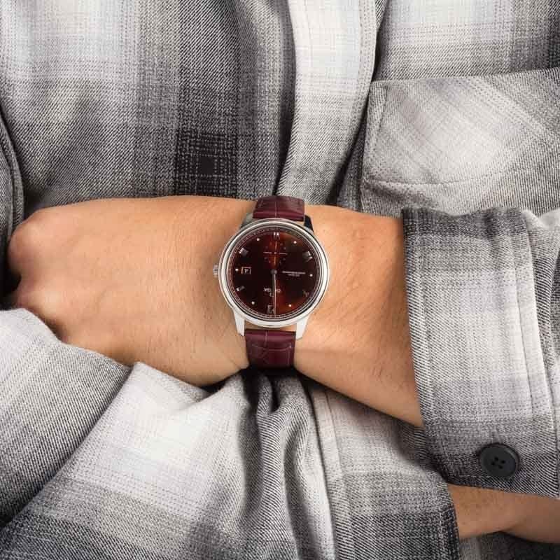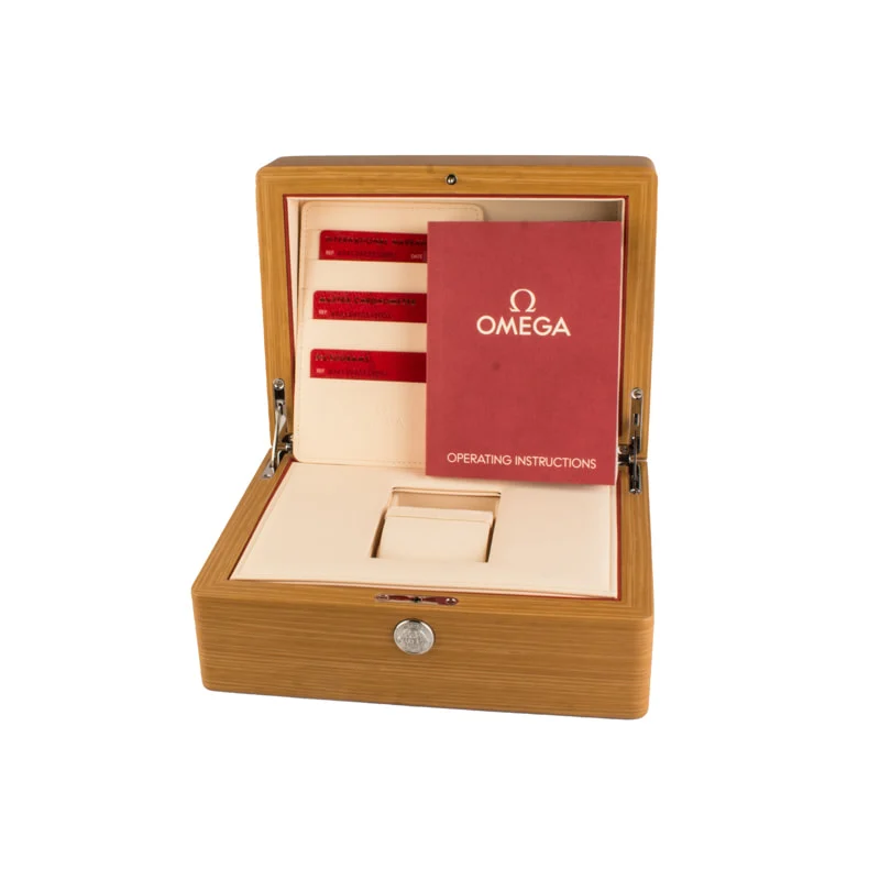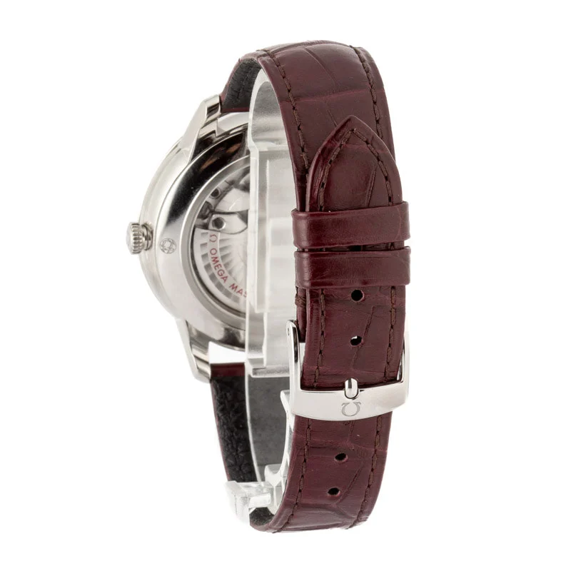 Pre-owned Omega De Ville Prestige ref 434.13.41.20.11.001 (2024) is a 3rd-generation model with the newer caliber 8802 self-winding Co-Axial movement and a colorful design set. This watch, which is available in many different expressions, is a remarkable burgundy and steel model. Features include a 41mm stainless steel case with a smooth bezel, a domed PVD wine burgundy dial with a delicate sun-brushed finish, and a sophisticated leather strap. Elegant, sweeping rhodium-plated hands adorn the dial alongside Roman numeral and petite cabochon hour markers, a small seconds counter at 6 o’clock, a date display, and the distinction of a Co-Axial Master Chronometer. A great all-rounder for any growing watch box.
