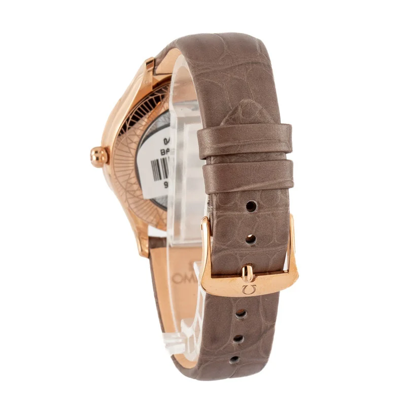 Pre-owned/unworn Omega De Ville Tresor ref 428.58.36.60.13.001 is a 36mm 18K Sedna™ gold model with diamond-encrusted lugs, a chic leather strap, the caliber 4061 quartz movement, and an exclusive “Her Time” decoration on the case back. The watch will suit most wrists, men and women alike, at 36mm in diameter, and features sweeping brilliant-cut diamonds on both sides of the case, one curving upwards and the other downwards for a symmetrical, eye-catching aesthetic. Ref. 428.58.36.60.13.001 also features a crown polished with “HyCeram” and set with a single, sparkling diamond, a lacquered taupe-brown dial adorned with embossed Roman numeral hour markers, and a matching taupe-brown leather strap.