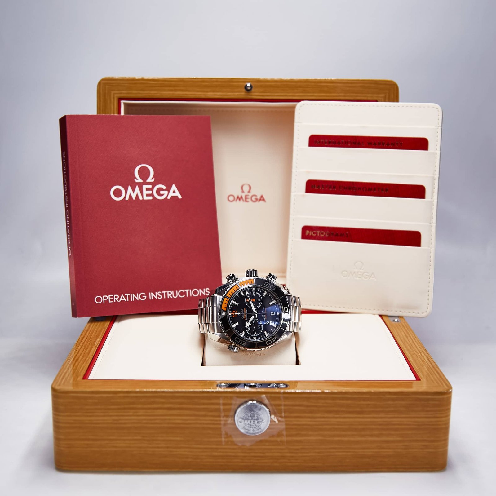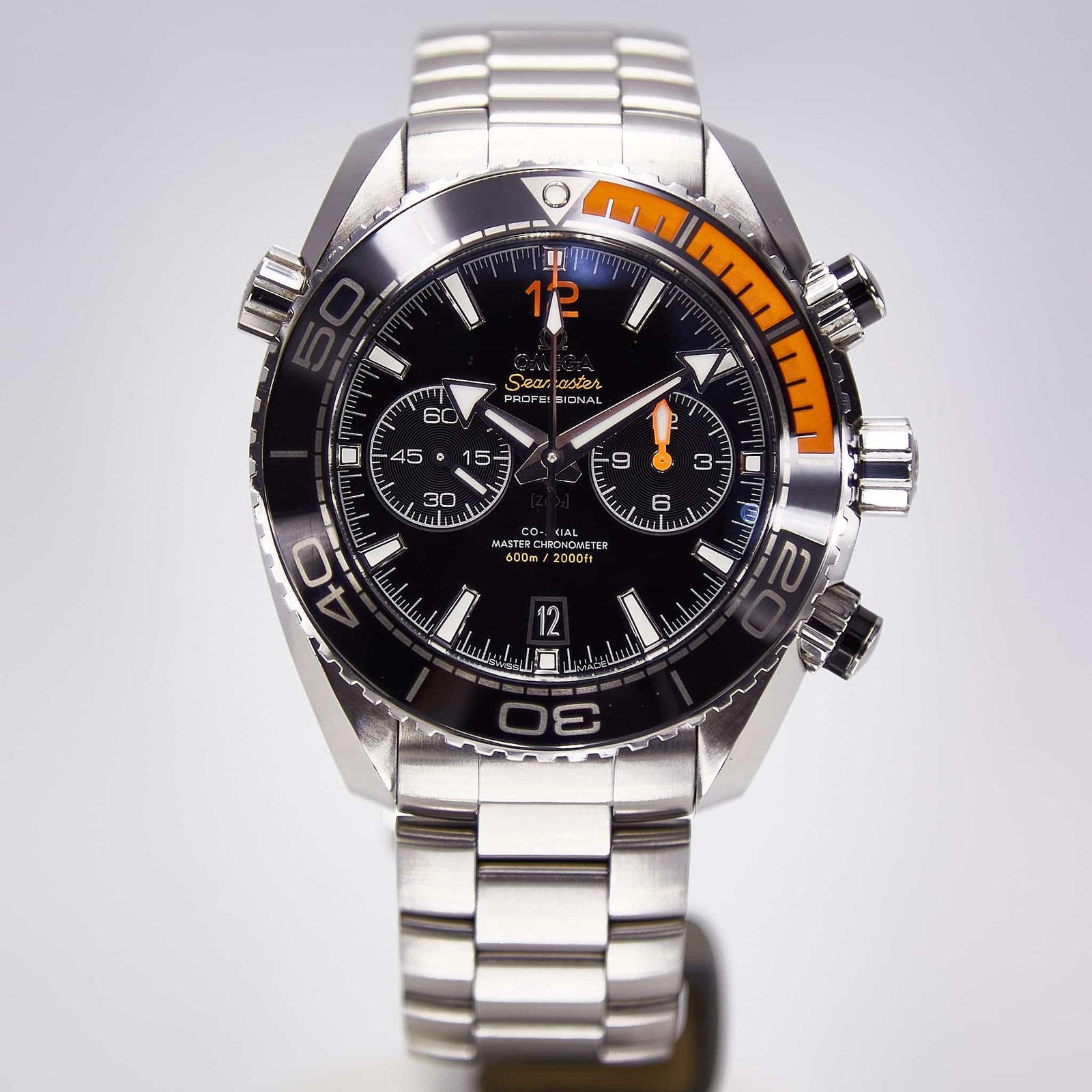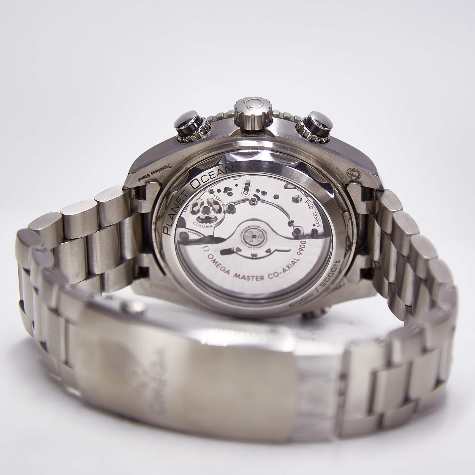 The Omega Seamaster Planet Ocean 600M Master Chronometer Chronograph is water resistant to 600 meters / 2000 feet), and has a helium-escape valve. The Omega Master Chronometer caliber 9900 at the heart of this timepiece can be seen through the transparent caseback. To achieve Master Chronometer status, it has passed the 8 rigorous tests set by METAS (The Swiss Federal Institute of Metrology).