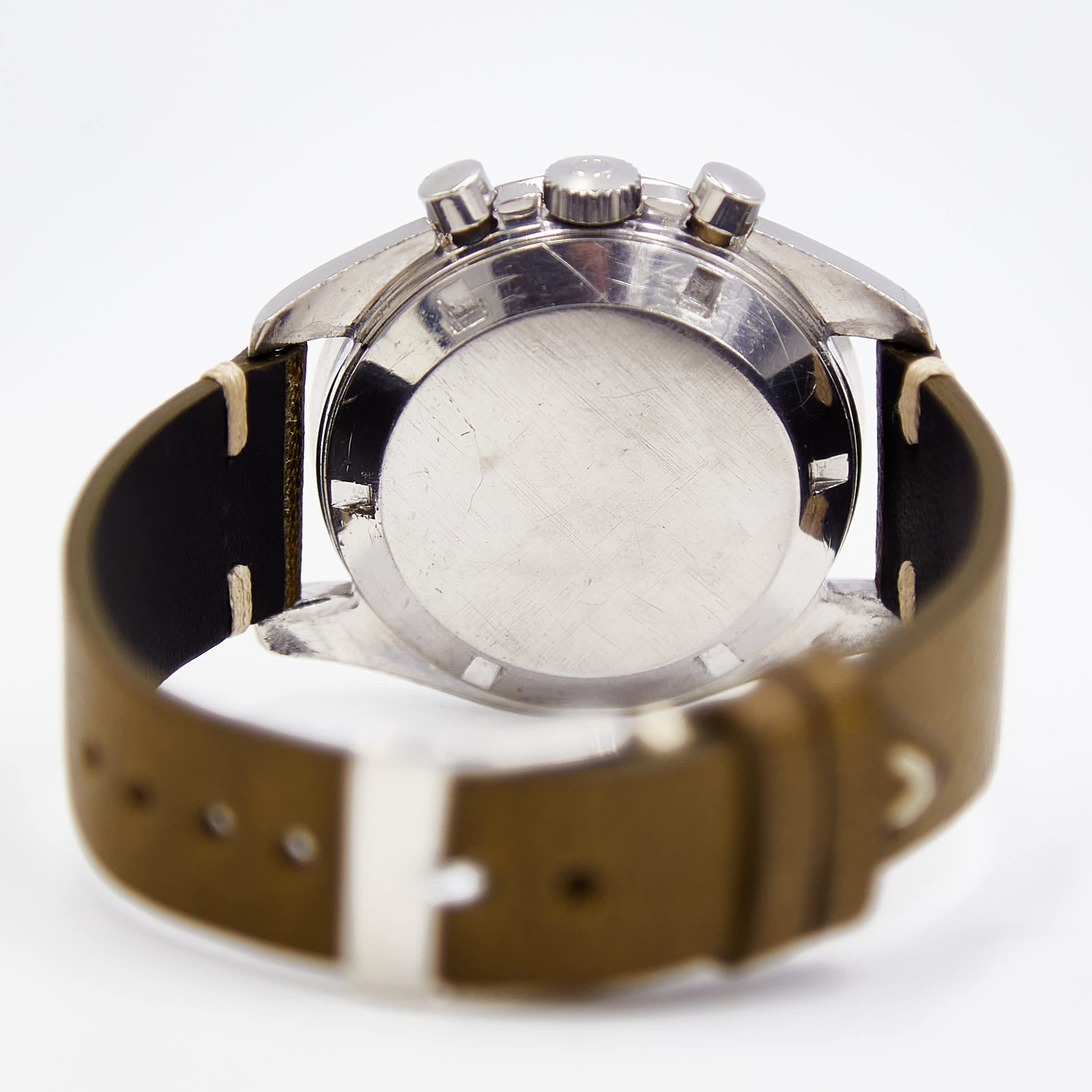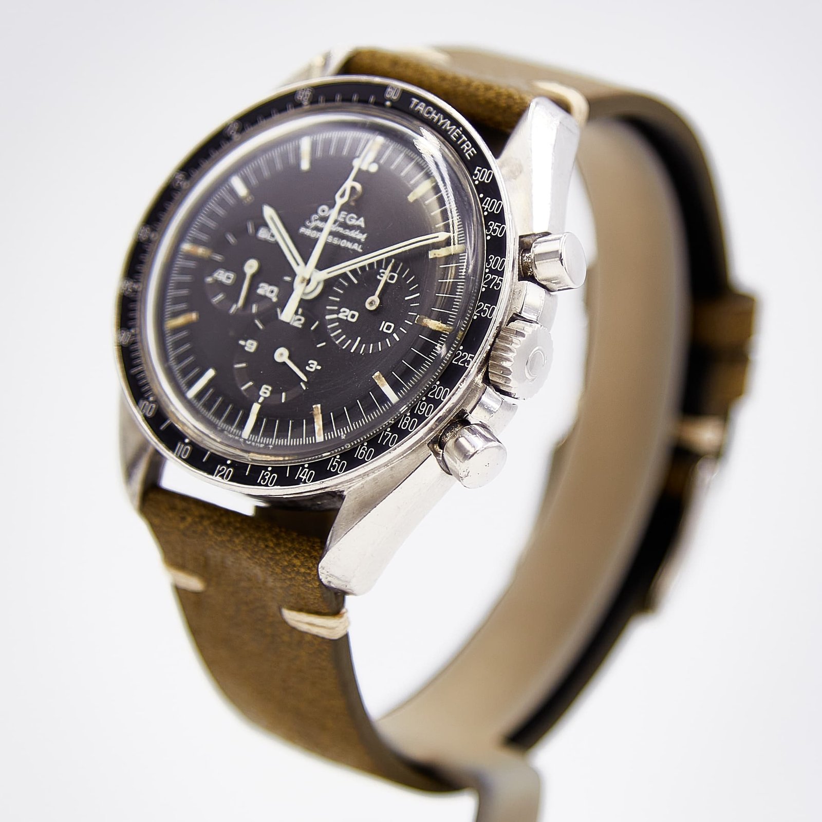 Widely known as the Moonwatch, this Omega Speedmaster is one of the more sought after as it was the model worn throughout the Apollo program. Several features set it apart from later Speedmaster releases, but it is the movement that captures the imagination of Speedmaster aficionados. The caliber 321 with its favored column wheel has recently been serviced, assuring the new owner of years of worry free wear. As part of the normal service, the hesalite crystal and the crown were replaced. In addition to the service and movement, the other highlight of the watch is the very nice condition Dot Over Ninety (DON) bezel and black step dial. Originally with tritium lume, the lume on many of the indices has worn away. This vintage Speedmaster is an appealing watch that still holds its connection between the climatic years of the Moon landing and the present every expanding Speedmaster fan base.