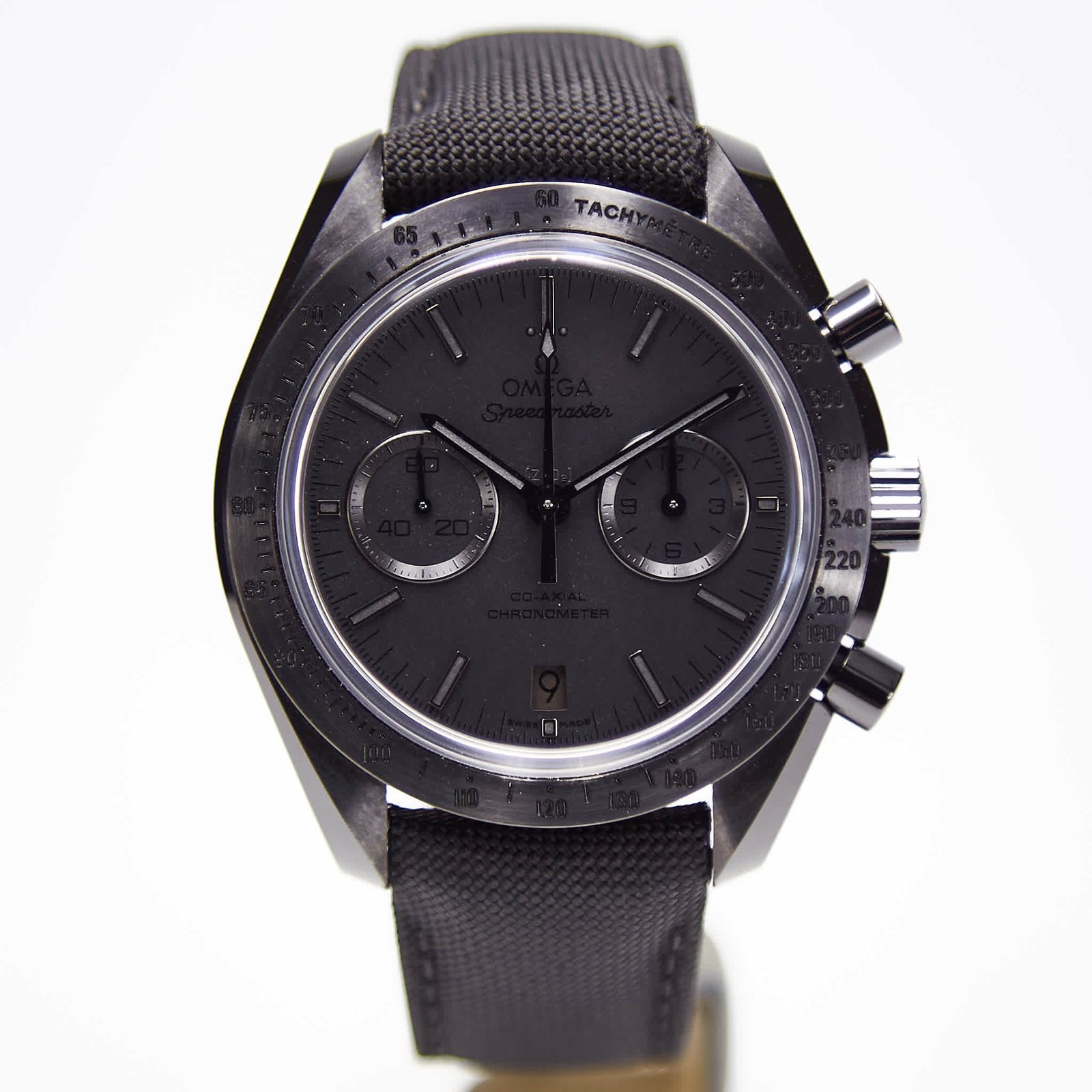 Giving this model its nickname are its brushed blackened Moonwatch-style hands and blackened applied indexes – all of which are coated with black Super-LumiNova. The familiar sub-dials at 3 and 9 o’clock are also matt black and the black ceramic bezel has a black lacquered tachymeter scale. At its heart is the Omega Co-Axial caliber 9300.