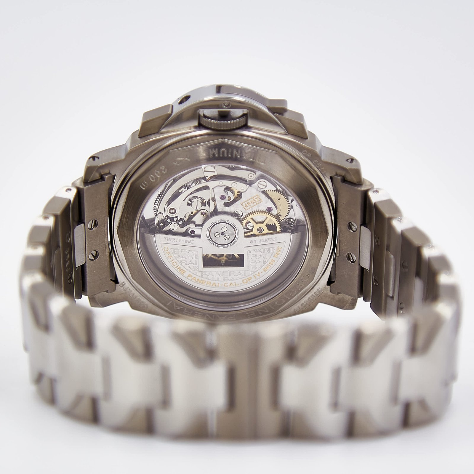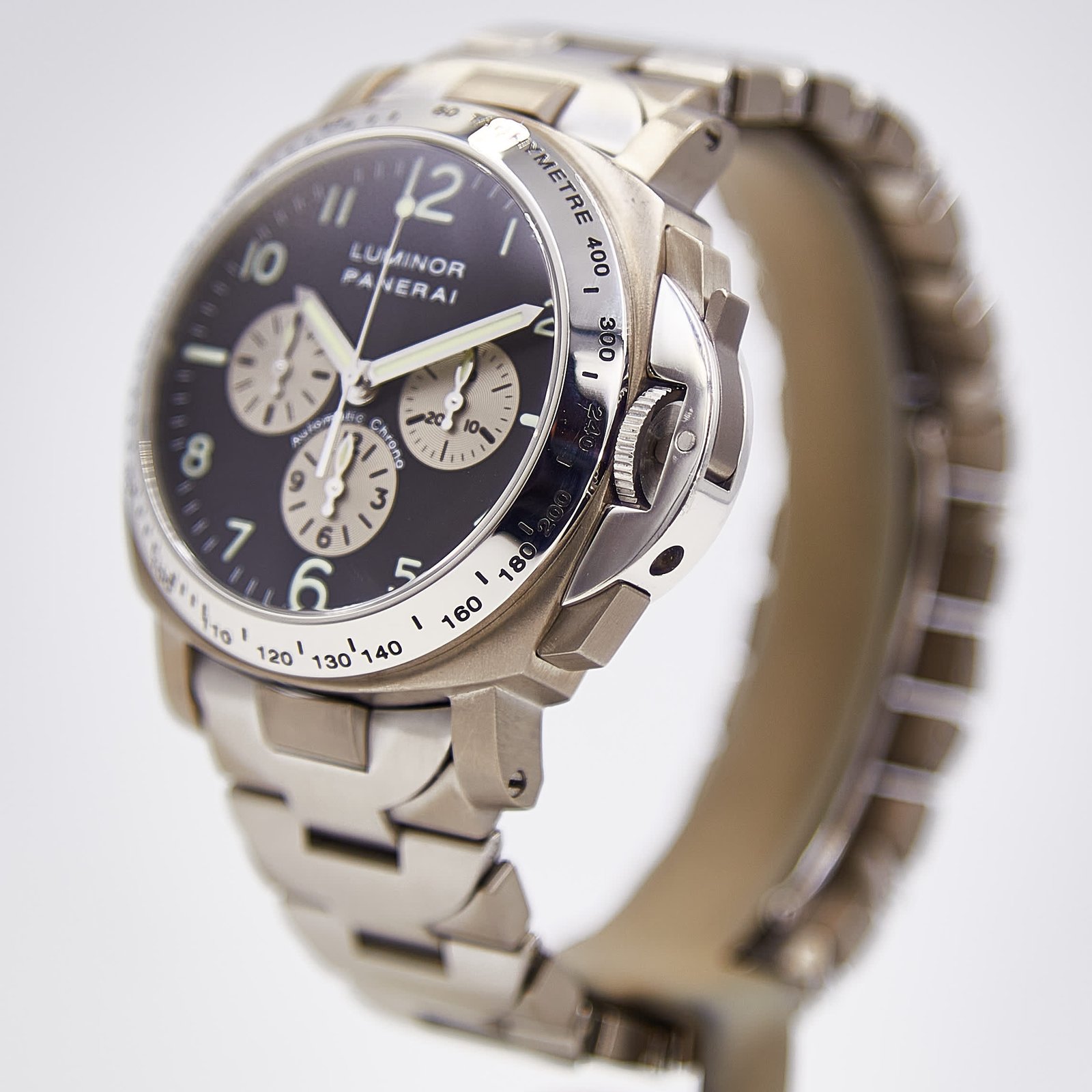 Pre-Owned Panerai 40mm Luminor Chronograph, Black Dial, Titanium Bracelet, Ref. PAM00052