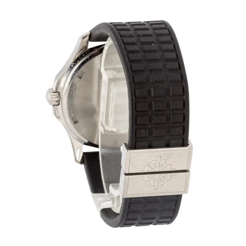 Pre-owned Patek Philippe Aquanaut 5067A-001 (2009). Patek followed the success of the Nautilus with the Aquanaut in 1997, a fresher, more contemporary take on the Nautilus’ distinctive design codes. As such, the case is paired with a rubber strap, and the dial is decorated with a bespoke waffle-textured motif. Ref. 5067A is a coveted 36mm stainless steel model with a diamond-encrusted bezel. Perfect for men and women alike, it has since become a highly sought-after edition of the Aquanaut collection. Furthermore, as a discontinued model, the pre-owned market is the best place to buy a Patek 5067A-001, and we have one for sale here today in excellent second-hand condition.