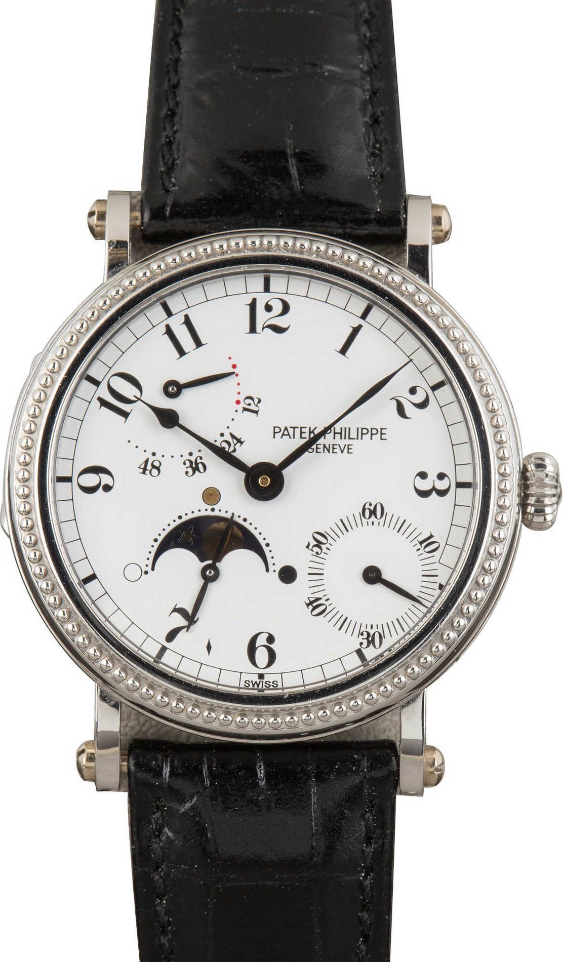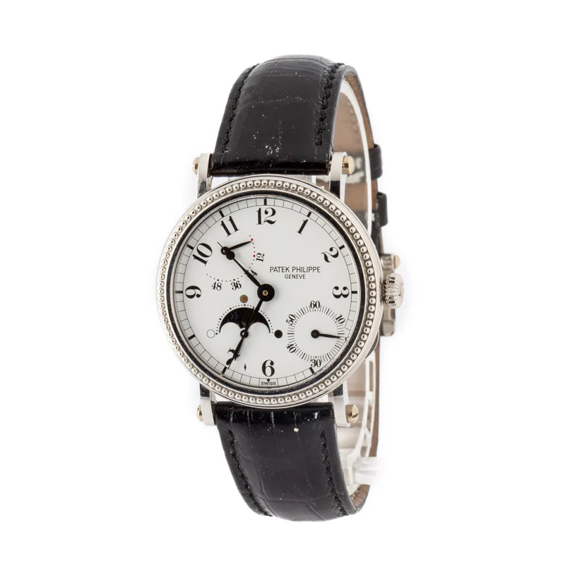 This pre-owned Patek Philippe Complications ref. 5015P features a 35.5mm platinum case with a white dial, elegantly displaying moon phase and power reserve complications. Powered by the Caliber 240 PS automatic movement, it offers a 48-hour power reserve. Finished with a platinum hobnail bezel, this sophisticated timepiece combines technical mastery with Patek Philippe’s signature refined design, making it a standout for collectors.
