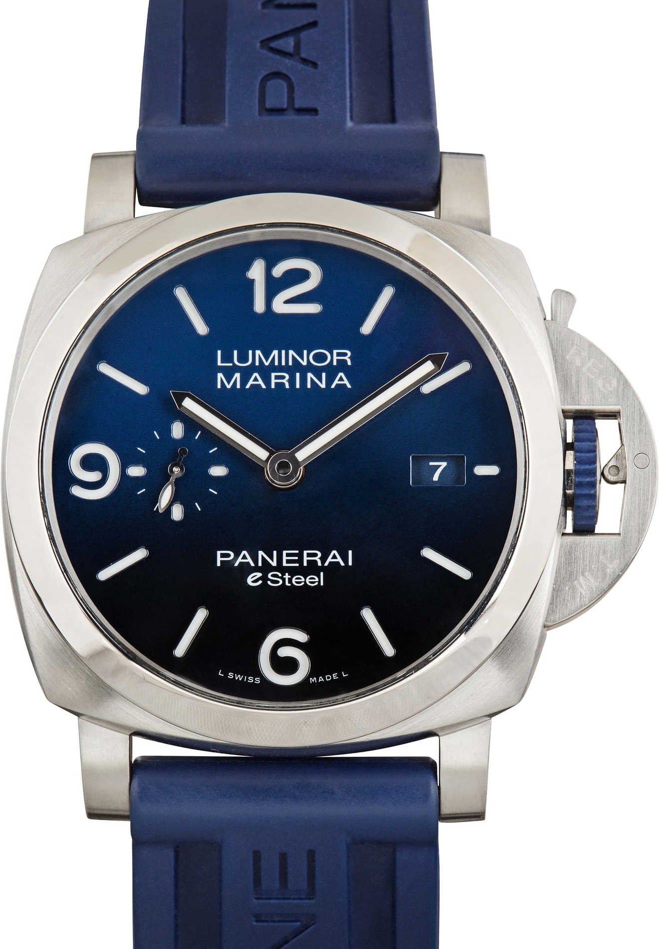 Pre-owned Panerai Luminor Marina ref PAM01157 (2023). Panerai released 3 “eSteel” watches in 2021, each 44mm in diameter and made of brushed eSteel, but with different color schemes. There was a green model, a grey model, and lastly, the “Blu Profondo” Panerai you see here with a striking blue gradient dial and a matching blue rubber strap. eSteel is a proprietary finish made largely of recycled materials, a product of Panerai’s initiative to be more sustainable in its watchmaking. Each model in the 2021 eSteel release features a rubberized crown to match the dial and the distinction “eSteel” on the dial. Ref. PAM01157 also features the mighty caliber P.9010, a self-winding mechanical movement with a 3-day power reserve.