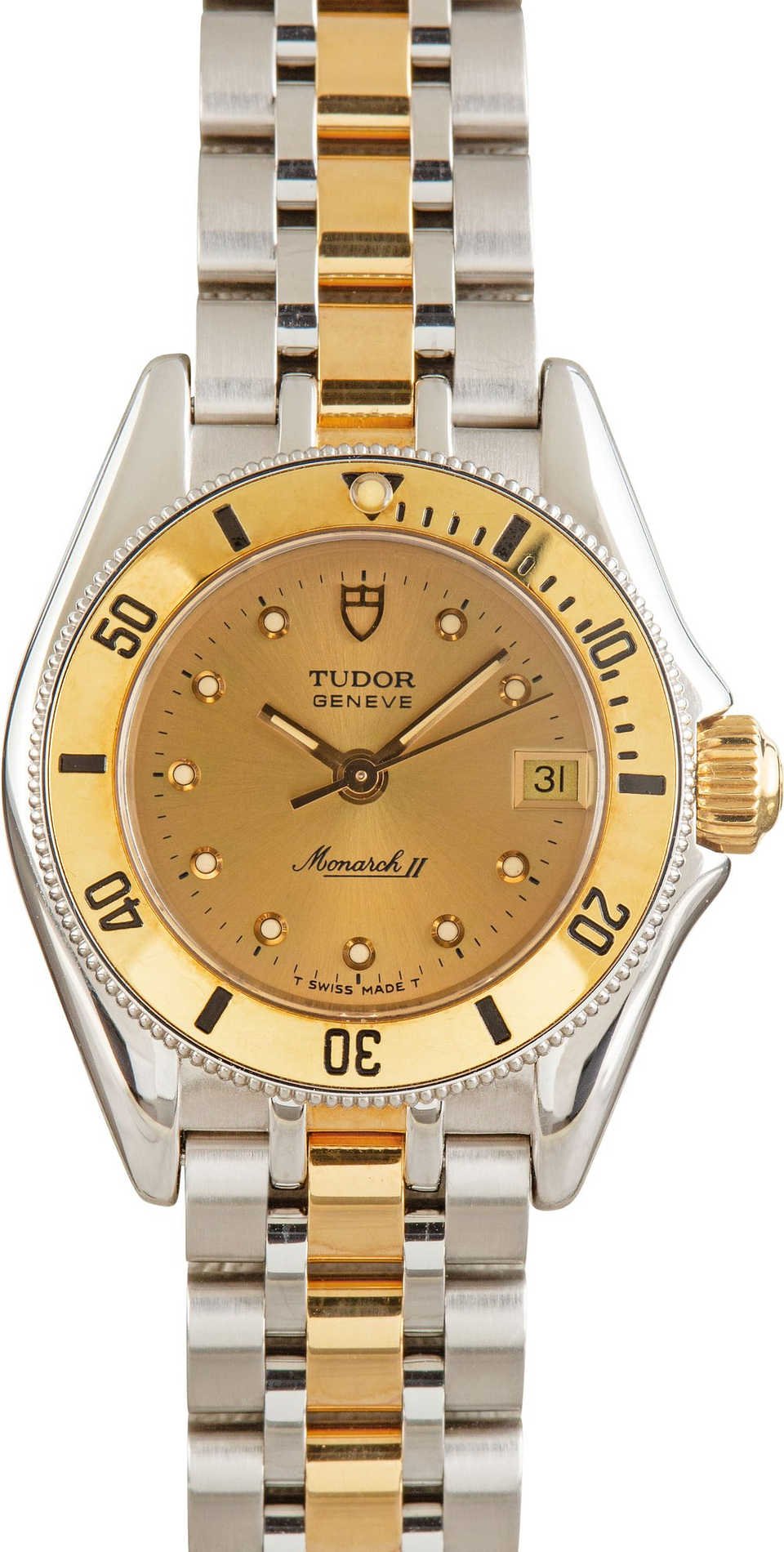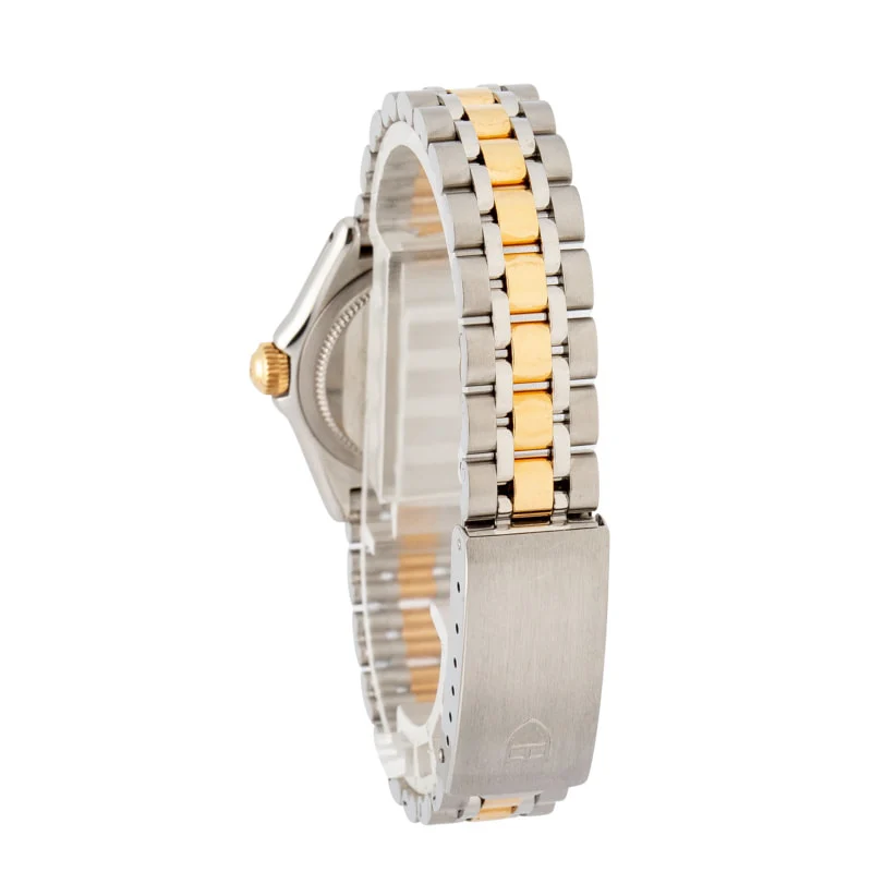 Pre-owned Ladies Tudor Monarch II ref 15853 (Circa 2000’s) is a petite, charming 25mm two-tone watch. The stainless steel and yellow gold case has a refined, jewelry-like feel, while the champagne dial brings just the right touch of vintage Tritium warmth. Simple dot hour markers and slim stick hands keep the layout clean and readable, with the softly aged Tritium adding a bit of character you can only get from an older watch. The iconic Tudor shield at 12 o’clock ties everything together, giving the dial a familiar brand identity without overpowering the design. Paired with an acrylic crystal and powered by a reliable quartz movement, it’s a low-maintenance, everyday-wearable Tudor that balances classic styling with a subtle hint of luxury.