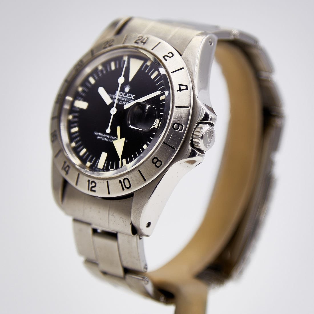 The Rolex Explorer II ref. 1655 was produced from 1971 to 1984. It was upgraded from the Explorer I with the addition of a date feature and an additional orange hand with the external 24 hours graduated bezel. The movement used in this watch is the caliber 1575. This Explorer II has a serial number that indicates a production year of 1977, as well as a Mark II dial that has been recognized as produced between 1972 to 1977, and finally a Mark III bezel that has been recognized as being in production from 1977 to 1980. The Oyster bracelet is a Rolex USA bracelet stamped “78”, with moderate stretch. Thus, the watch appears to carry its original components. In addition, the case is sharp and appears unpolished, with slight swirls from wear but with no nicks. The beauty of a watch is the dial, and this matte black dial is in lovely condition, free of marks or debris. The tritium lume is intact and has aged to an attractive manilla color. The 24 hour hand, which was originally orange has faded to nearly match the color of the lume patina, giving it what some collectors call a “ghost hand.” The crystal is the correct acrylic with cyclops and is clear. Watchworks has recently serviced this watch to ensure years of worry free wear. This watch should please discriminating collectors and fans of vintage Rolex watches.