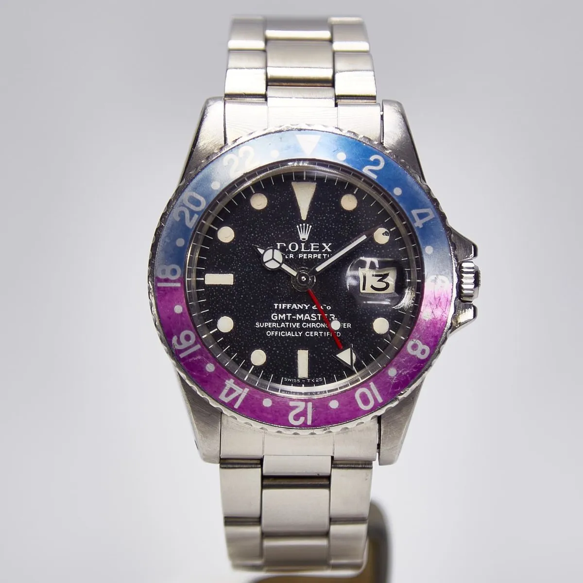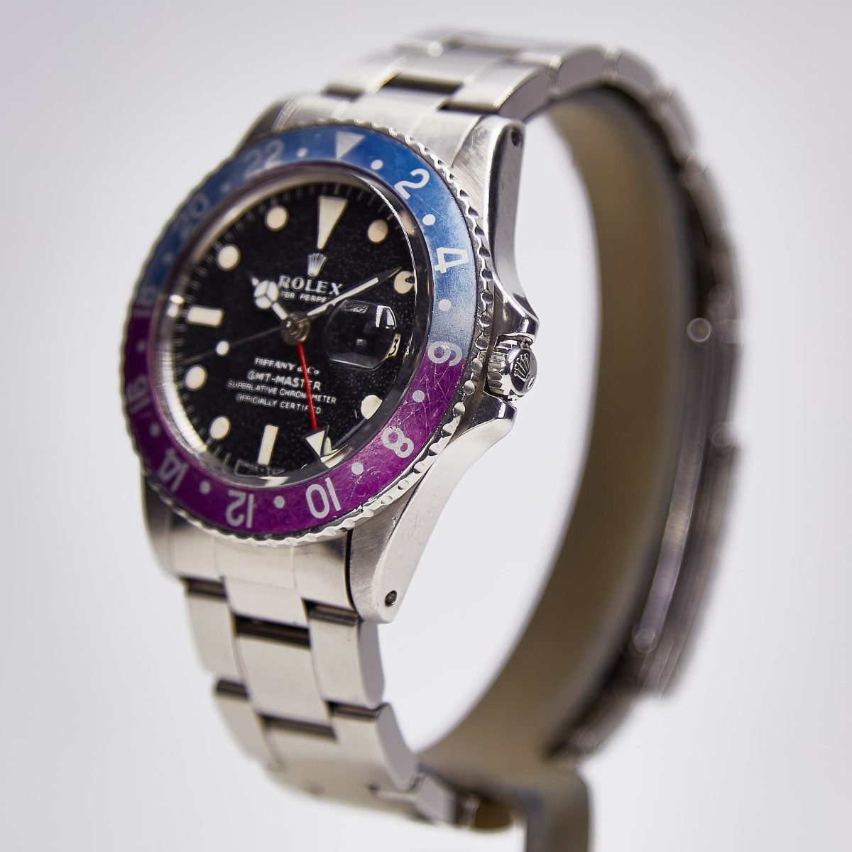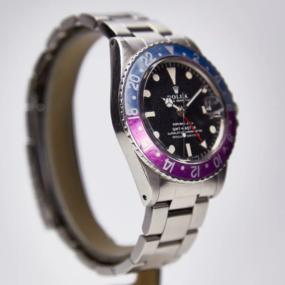 The GMT Master reference 1675 watch here is clearly a special watch. In addition to its unusual features such as the Fuchsia bezel and Tiffany co-brand, it is in excellent condition. Acquired from the original owner years ago and stored by us, the watch has light wear scratches on the bezel and case and an even overall patina that comes with natural aging. The case chamfers are slightly less sharp than when the watch came from the factory but they appear to be the result of wear and the case appears unpolished. The dial and lume appear original and intact, with light speckling on the matte dial that is visible under magnification. The hands are service hands and in excellent condition. It is not unusual to find the original steel hands to have been replaced by Rolex when serviced as these often rusted. Attached to the watch is a service Oyster bracelet also in excellent condition. We hope and trust that you will find this an exceptional watch that will bring joy for years to come.