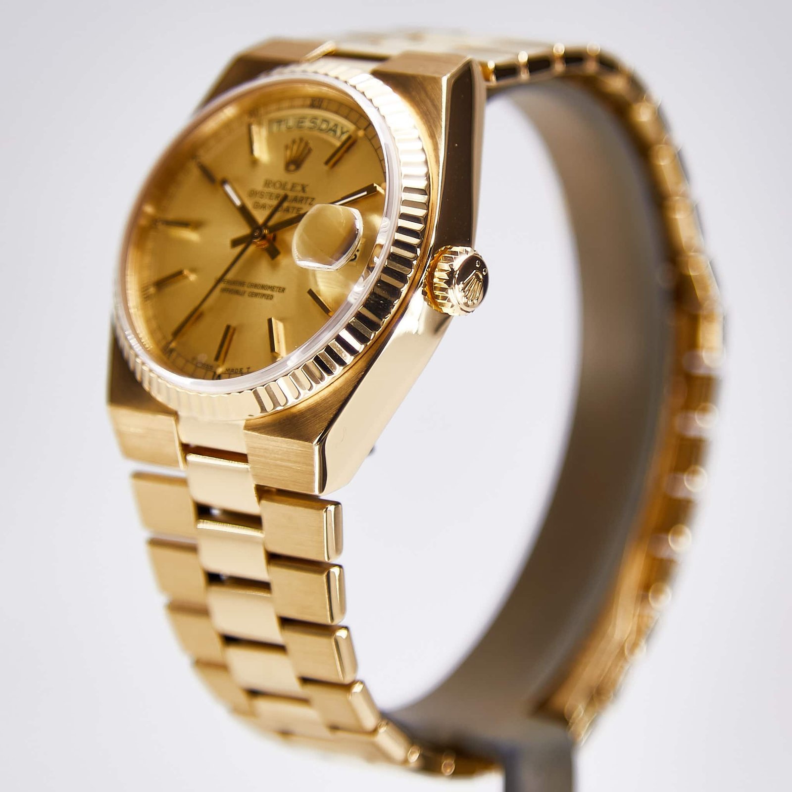 The Rolex Oysterquartz Day-Date “President” represents a unique chapter in Rolex’s history, produced from 1977 until the early 2000s. Introduced during the height of the quartz crisis, the Oysterquartz combined Rolex’s traditional prestige with cutting-edge quartz technology. Unlike most of Rolex’s models, the Oysterquartz featured a distinct angular case and integrated bracelet, giving it a bold, modern look influenced by 1970s design trends. The Day-Date version carried the same prestige as its mechanical counterpart, crafted in solid gold and often seen with the iconic President bracelet, but it housed Rolex’s in-house quartz caliber 5055, known for its precision and reliability. Although never produced in large numbers compared to mechanical Rolex models, the Oysterquartz Day-Date remains a rare and fascinating piece, representing Rolex’s careful engagement with quartz technology while staying true to its luxury identity. Collectors today value it both for its scarcity and its strikingly different design within the Rolex lineup.