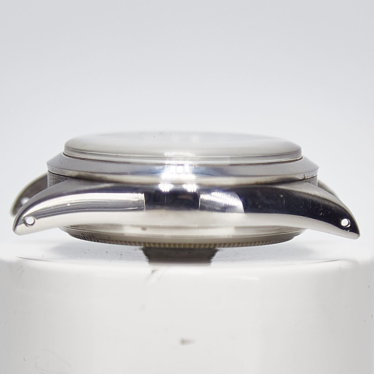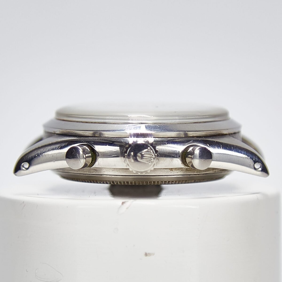 The reference 6238 came with several dial types. This silver dial version is seen slightly more often and is also one of the more attractive. The dial includes a printed tachymeter scale, which gets moved to the steel bezel on the Daytona 6239 that follows. While easier to read in a speeding car, the smooth bezel of the pre-Daytona and the tachymeter on the dial is a more attractive watch. Note also that this watch includes the ‘-T swiss T-‘ at the bottom and not just ‘T Swiss T’. The dials without the dash may be Rolex replacement dials. Regardless, this dial is clearly an original, including the intact tritium lume. Later production 6238 watches switched to baton hands, which this watch includes. The first Daytona that followed carried over the baton style hands, as well as most of the dial layout. In fact, the case size, the baton hands, the plexi, the pushers and the winding crown – all are exactly the same for a 6238 and the first Daytona reference 6239.