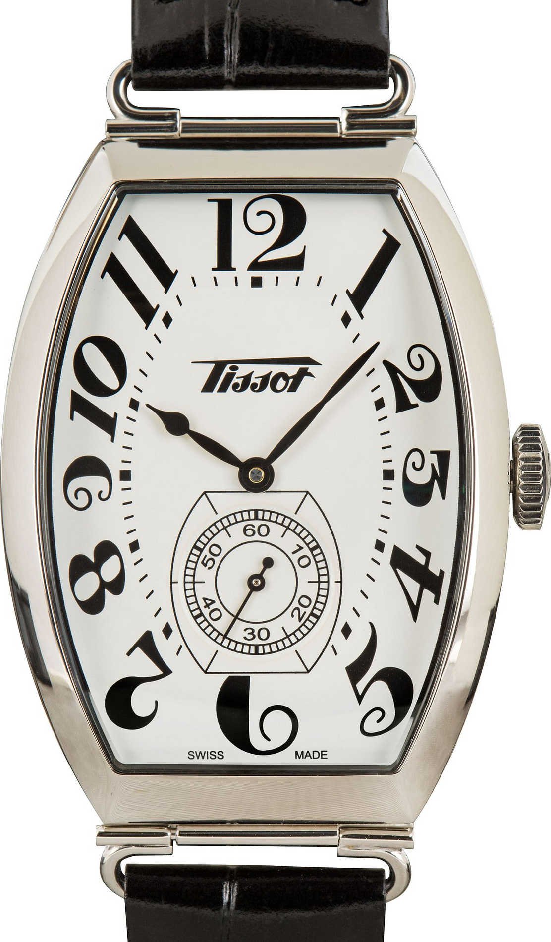 Pre-owned/unworn Tissot Heritage Porto Mechanical ref T128.505.16.012.00 is a heritage collection watch inspired by a timepiece from the 1910s.  It has a striking tonneau-shaped case with a domed profile and a dial decorated with swirling Breguet-style hour markers.  The case is dressed in versatile 316L stainless steel and features a domed sapphire crystal with AR coating, a 31.1mm measurement, and 10.5mm thickness.  The Alligator-style grained cowhide leather strap features a butterfly clasp and attaches to the case with striking wire lugs.  This vintage-inspired Tissot also sports a reliable Swiss mechanical movement with a convenient 42-hour power reserve.