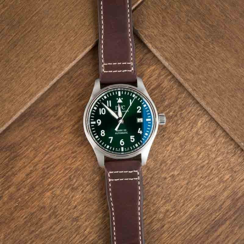 Pre-owned IWC Pilot’s Watch Mark XX ref IW328205 (2022). IWC released the Mark XX back in 2022, initially with classic black and blue dials. A few months later, it expanded the collection with four new models in new dial and bracelet/strap options. Among the newer references added was the IWC IW328205 for sale here with a green sunray dial and brown leather strap. The 40mm stainless steel case wears slim at just under 11mm thick, with the familiar oversized crown and a solid caseback stamped with an aircraft motif. Inside is the automatic caliber 32111, with an impressive five-day power reserve, a big step up from earlier Mark models. A soft-iron inner case helps with magnetic resistance, staying true to its aviation roots. It’s not flashy or experimental, just a well-sorted pilot’s watch with a little extra personality.