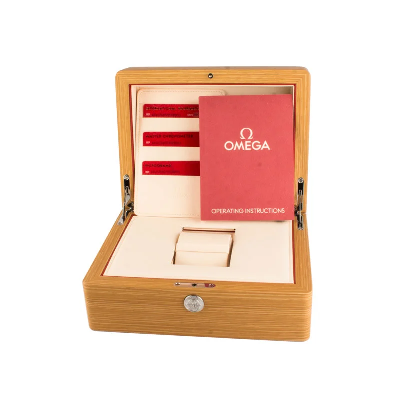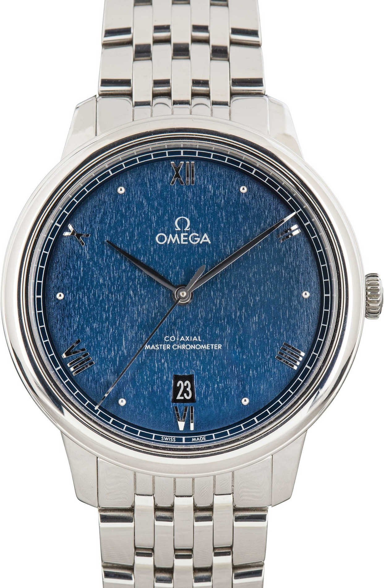 Pre-owned Omega De Ville Prestige ref 434.13.40.20.02.001 (2024). The De Ville Prestige has been around since the mid-1990s, and this third-generation version sticks closely to that original idea of clean, dress-forward design without feeling old-fashioned. It’s the kind of watch that settles into daily wear instead of trying to announce itself. The 40mm stainless steel case frames a domed dark blue dial with a subtle vertical pattern that catches the light more than you might expect. Roman numerals alternate with cabochon-style hour markers, giving the layout some rhythm, while the date window sits neatly at 6 o’clock. A railway minute track around the edge pulls everything together. Inside, the watch is powered by the caliber 8800 self-winding movement with a 55-hour power reserve.