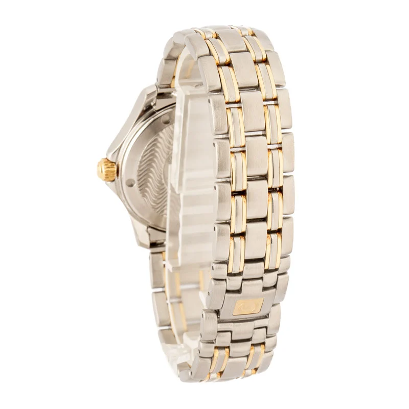 Pre-owned Omega Seamaster ref 2301.21.00 (2000) comes from a line that has long been tied to Omega’s idea of a dependable, everyday sports watch. The Seamaster name dates back to the late 1940s and has always been about water resistance, durability, and versatility. Over the years, the collection expanded to include a range of sizes and styles, including more refined two-tone watches like this one. This example pairs a stainless steel and yellow gold case with a matching two-tone bracelet, giving the watch a slightly dressier aesthetic while retaining its sporty roots. The 36.25mm case wears comfortably and sits right in that classic mid-size range. The white dial features a subtle wave pattern through the center, along with gold hour markers and skeleton hands that keep the look distinctly Seamaster. A date window sits neatly at 3 o’clock, and a sapphire crystal with anti-reflective treatment protects the dial. Inside is Omega’s caliber 1120, a self-winding movement with a 44-hour power reserve.