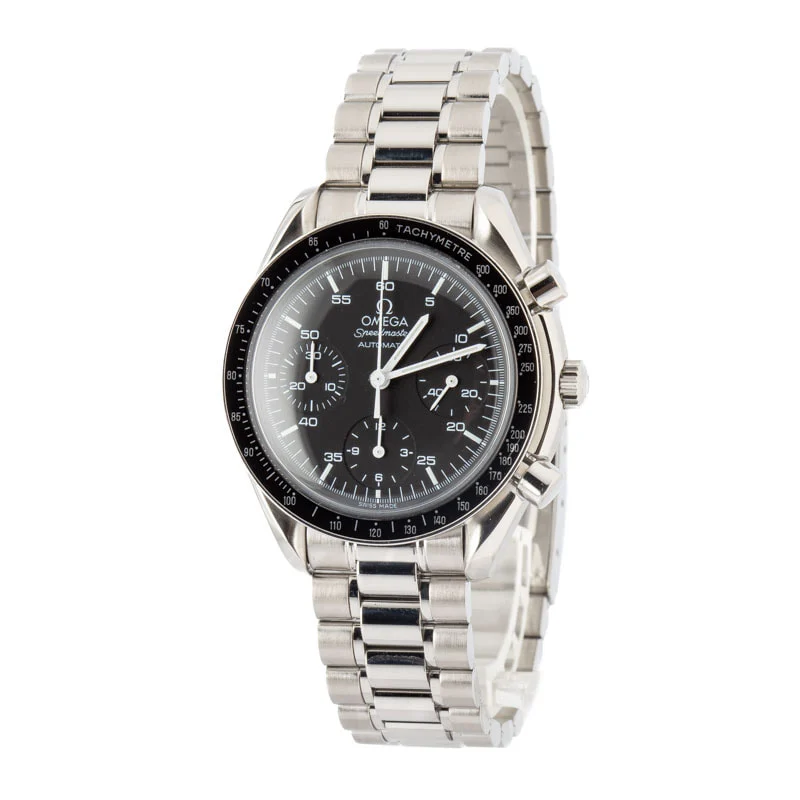 Pre-owned Omega Speedmaster ref 3510.50.00 (1999 – 2010) was the product of the brand’s efforts to appeal to a broader range of collectors by featuring a slightly smaller case size but with the same iconic Speedy aesthetic. Measuring 39mm in diameter, the Omega Reduced is just a few millimeters smaller than the rest of the lineup. It also features the Omega caliber 3220, a self-winding movement with a convenient 40-hour power reserve. However, much like other Moon Watches, the case is coveted by a Hesalite crystal and features a black tachymeter bezel, a traditional tri-compax dial, and twisted Lyre lugs. This model is perfect for anyone in the market for a smaller edition of the famous Omega Speedmaster. Add it to your collection today in excellent secondhand condition.