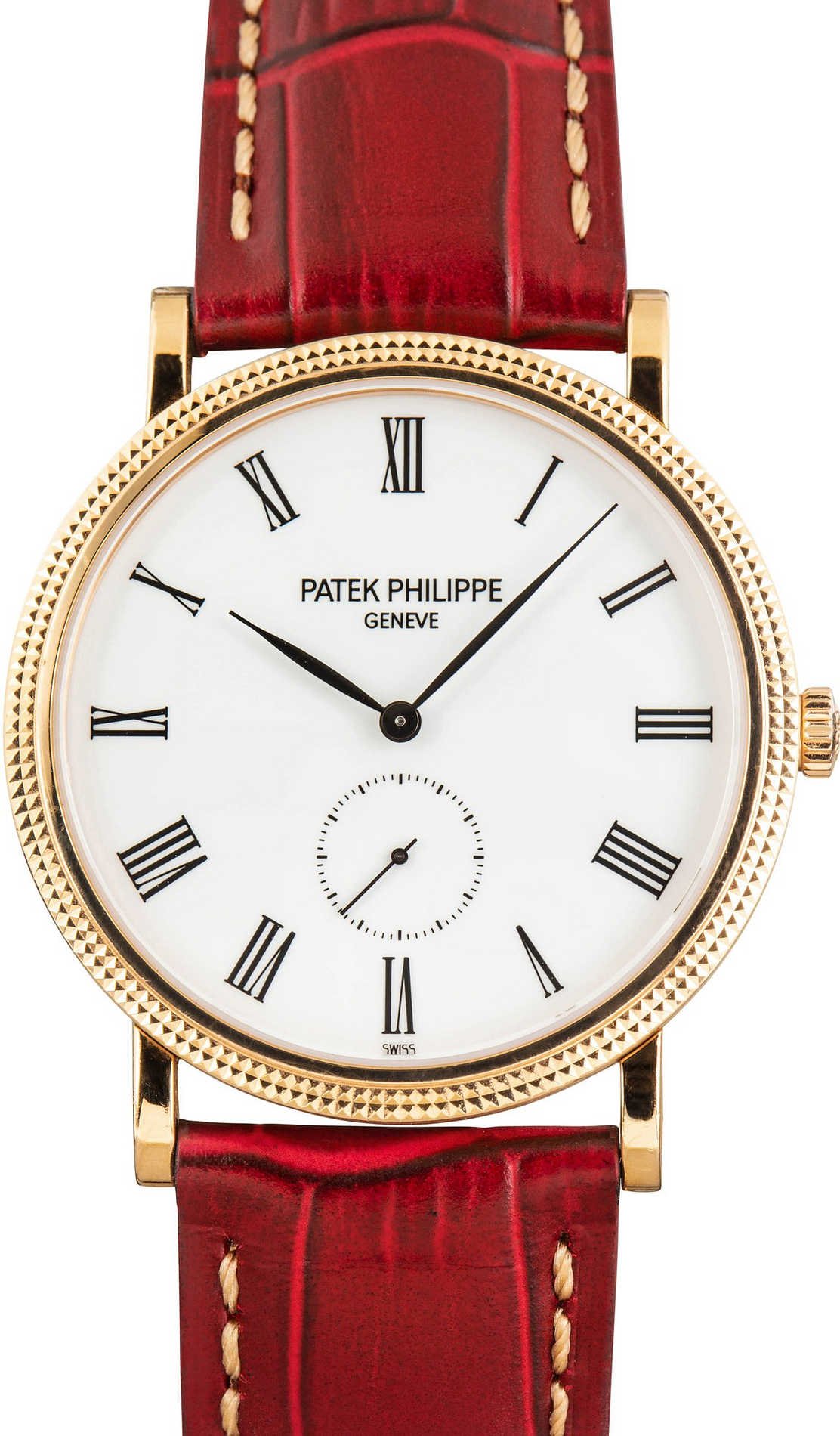 Pre-owned Patek Philippe Calatrava 5119R-001 (2019) is one of those watches that reminds you why Patek’s simplest designs tend to age the best. At 36mm, the rose gold case feels intentionally restrained, and the signature hobnail, or Clous de Paris, bezel adds just enough texture for dimension and character. The white dial is classically Patek, laid out with painted black Roman numerals, slim dauphine-style hands, and a small seconds display at 6 o’clock. There’s nothing extra here, and that’s very much the point. On the wrist, it wears light and elegant, especially paired with a leather strap that suits the case beautifully. Inside, the manually wound caliber 215 PS is about as traditional as it gets, finished to Patek’s exacting standards and designed for owners who still enjoy the ritual of winding their watch. As an entry into gold Patek Philippe ownership, the 5119R feels thoughtful and timeless, the kind of watch you can live with for decades without it ever feeling dated.