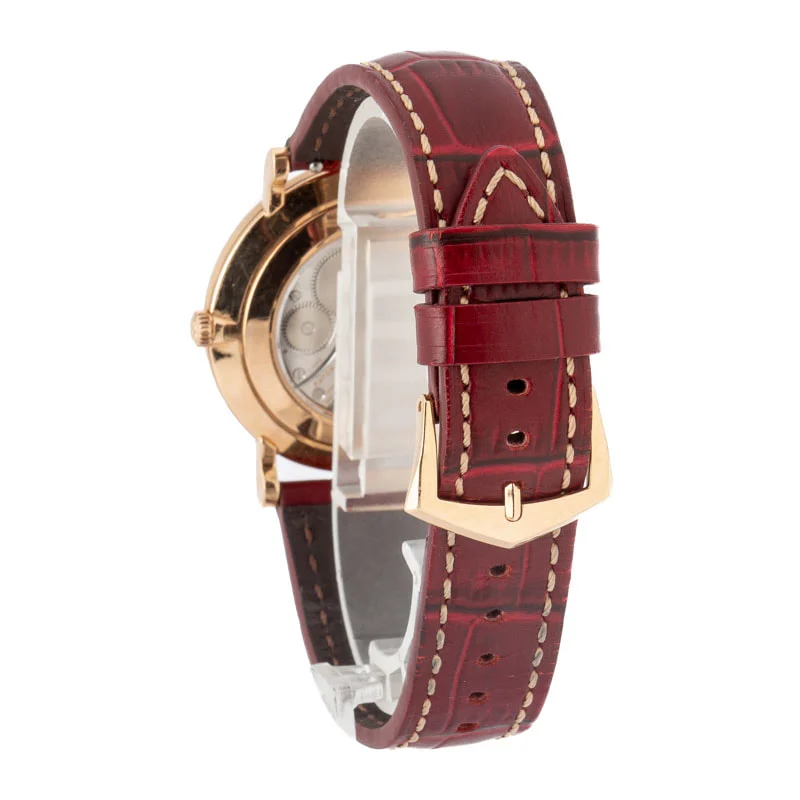 This pre-owned Patek Philippe Calatrava ref. 5119R-001 (2019) epitomizes classic elegance and refined craftsmanship. Housed in a 36mm 18k rose gold case with a signature hobnail bezel, it features a white dial with black Roman numerals and oxidized feuille hands, complemented by a small seconds subdial at 6 o’clock. The watch is powered by a manual-winding movement visible through the transparent sapphire exhibition case back, while the 18k rose gold crown bears the Patek Philippe logo, a mark of distinguished heritage. Finished with a scratch-resistant sapphire crystal, this Calatrava balances timeless style, mechanical excellence, and the understated luxury that defines Patek Philippe.