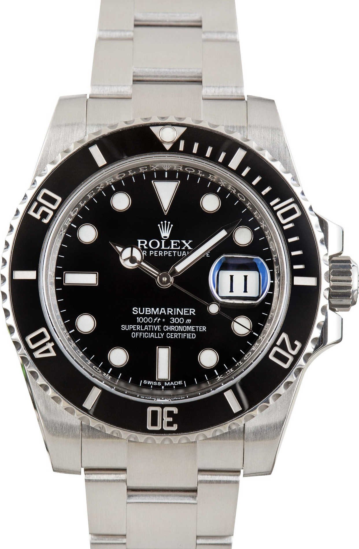 Pre-owned Rolex Submariner ref 116610 (2011 – 2020) was the first stainless steel Submariner Date to feature a durable ceramic bezel. The previous ref. 16610 was furnished with aluminum, and although it was also 40mm, it had slightly more understated proportions, thanks to smaller crown guards and narrower lugs. As a result, this watch wears a bit differently on the wrist. It exudes contemporary elegance without forsaking its dive watch roots, either. The case is still rated waterproof up to 100 meters, and the bezel features a unidirectional rotation for safer underwater timekeeping. Rolex recently discontinued this model in favor of the incoming 41mm generation. Still, it remains a highly sought-after collector’s item on the secondary market.