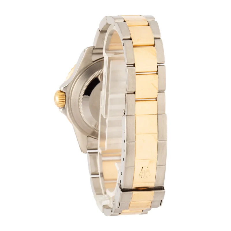 Pre-owned Rolex Submariner ref 16613 (1999) is the classic two-tone Submariner: stainless steel and yellow gold, with the rich blue aluminum bezel that made the 16613 such a popular option in the lineup. What really sets this example apart is the silver Serti dial. Instead of standard flat luminescent hour markers, it features factory-set diamonds and blue sapphires marking the hours. It’s a detail that completely changes the personality of the watch. It still has a 300-meter dive rating and all the Submariner DNA, but visually, it’s far more luxurious than utilitarian. In certain light, the stones almost disappear into the dial. In others, they pop. Powered by the caliber 3135, this five-digit Submariner occupies a unique spot in the brand’s lineup, a window collectors gravitate toward…the aluminum bezel, slimmer case proportions, and just enough personality to stand out in a crowded room.