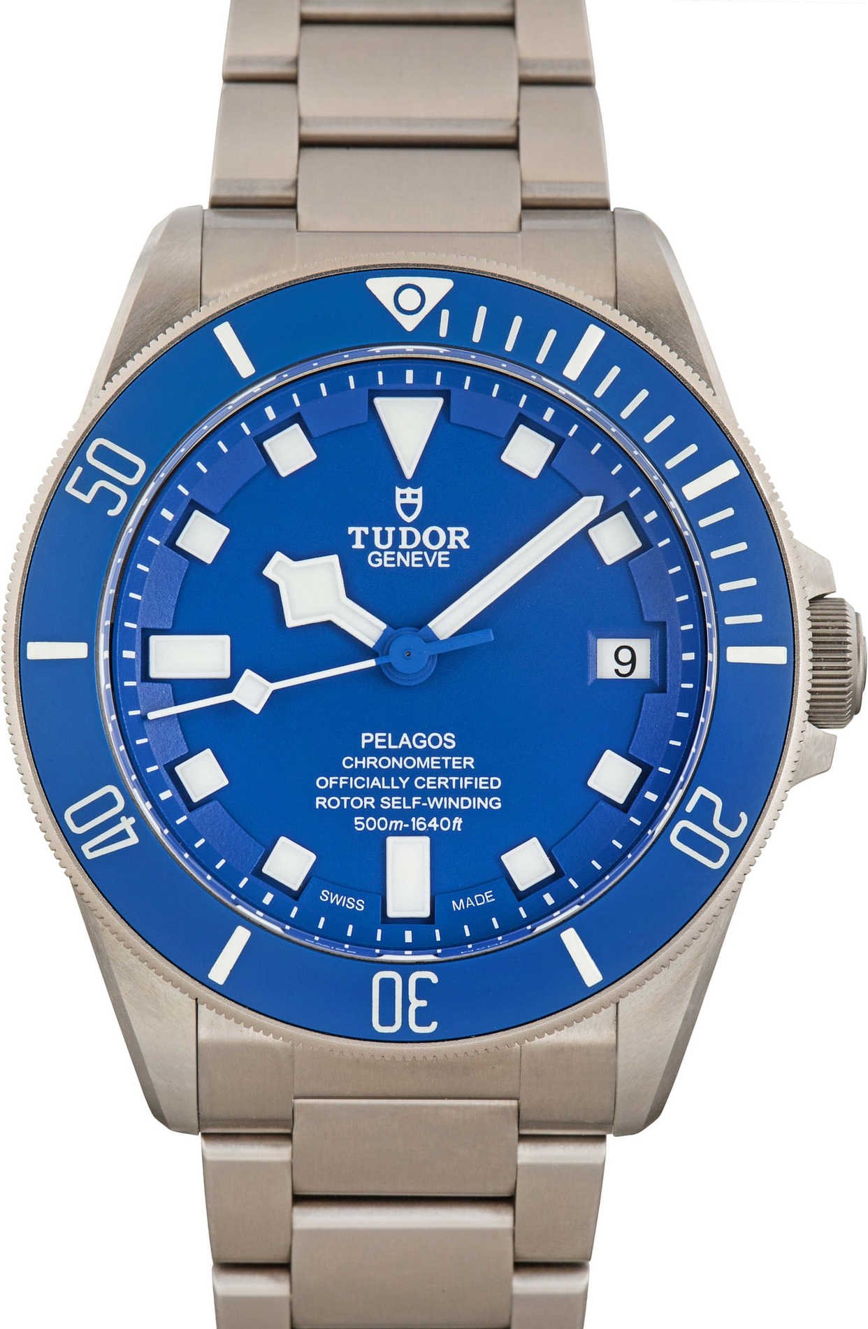 This pre-owned Tudor Pelagos ref 25600 (2025) is Tudor’s no-compromise modern dive watch. While the Black Bay is vintage-inspired, the Pelagos is built like a contemporary instrument. The 42mm case is primarily titanium with a satin finish, which keeps it surprisingly lightweight despite its serious 500-meter water resistance. At 14.3mm thick with a 22mm lug width, it wears purposeful but balanced. The matte blue dial with bright white indices is all about legibility, paired with a unidirectional titanium bezel featuring a ceramic insert and fully luminescent graduations. There’s a helium escape valve at 9 o’clock and a titanium crown stamped with the Tudor shield.  Inside beats the COSC-certified manufacture caliber MT5612 with a 70-hour power reserve. It’s robust, anti-magnetic, and meant for real-world use. The titanium bracelet includes Tudor’s patented extension system, allowing it to adjust automatically over a wetsuit.