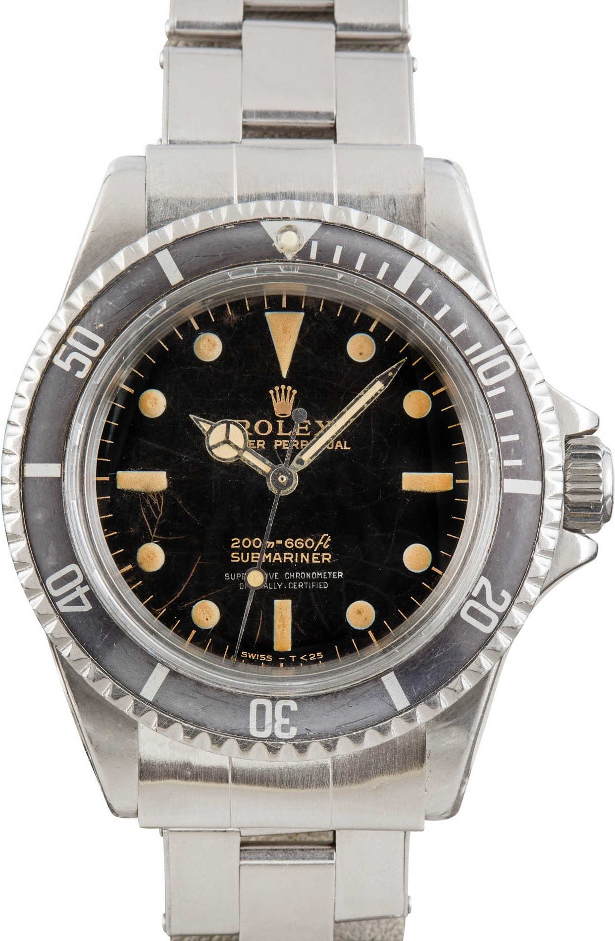 This example dates to circa 1966 and features a gilt, glossy dial—one of the last glossy variations before Rolex transitioned to matte dials. Over time, the surface has developed a distinctive cracks, earning it the nickname “Spider Dial,” as the pattern resembles a spider’s web. The term gilt refers to the gold-colored printing of the Rolex logo, model name, and depth rating, while glossy describes the deep, shiny black surface of the dial. This dial has the additional two lines of text beneath the depth rating, applied directly to the dial. There’s something special about these gilt glossy Submariners that collectors covet and this one with its “Spider dial” has a unique look you wont find on another one.