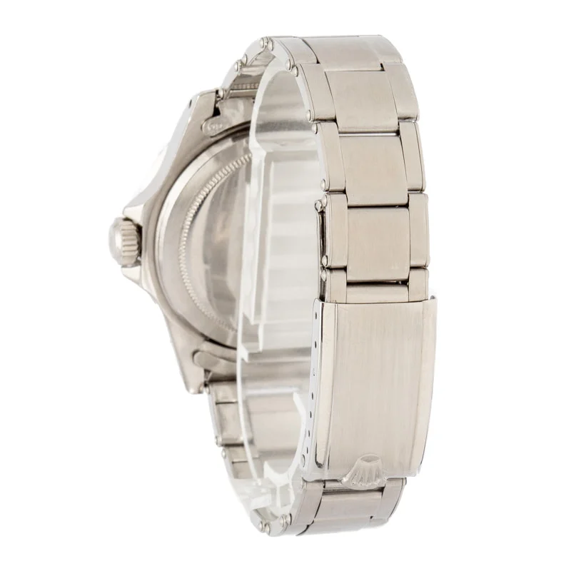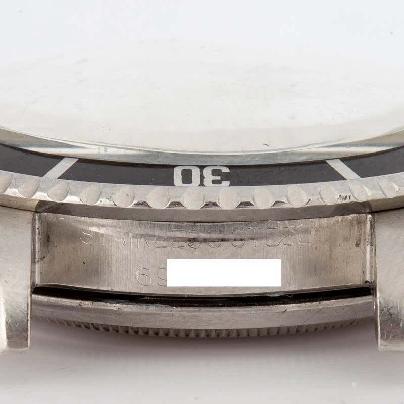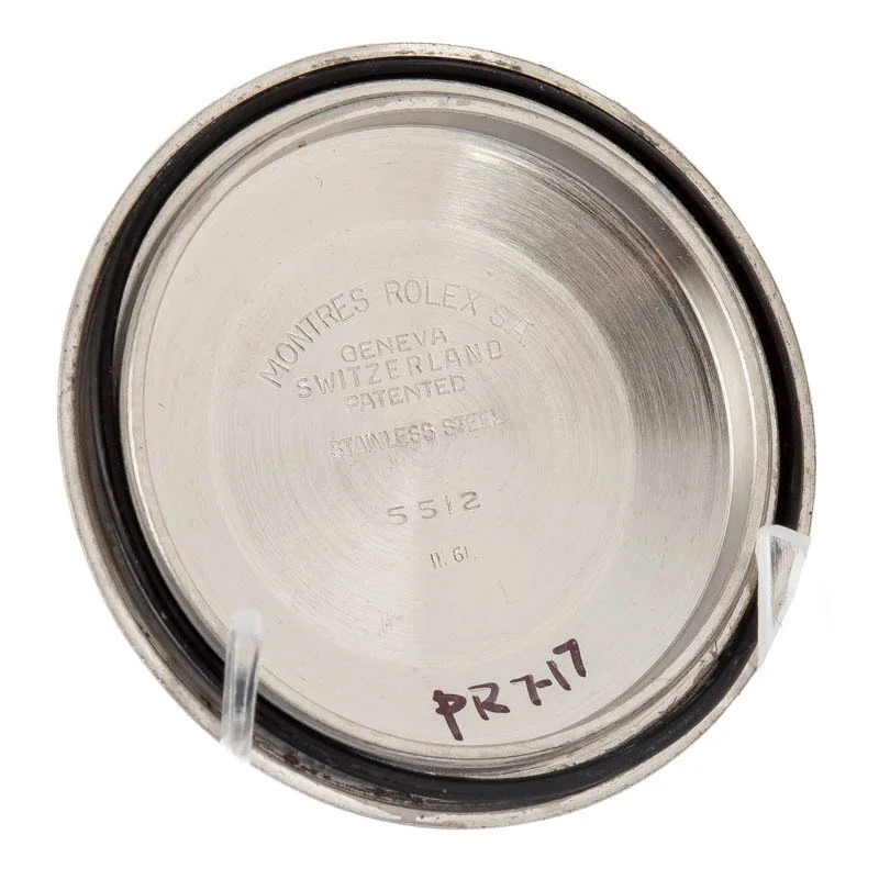 This 5512 features a glossy dial with chapter ring and four lines of text at the bottom. When looking closely you can see that the four lines of text on the dial are two colors; the top are gold and the bottom are silver that was printed directly on top of the dial – we love this little detail! The watch also has pointed crown guards which came directly before the standard rounded style crown guards that Rolex started using around 1964. These early 5512s are special watches and it takes a real connoisseur to appreciate these subtle details. From the well preserved “Long 5” bezel to the chapter ring dial, and Swiss rivet Oyster bracelet – this has that vintage look and feel collectors seek out.