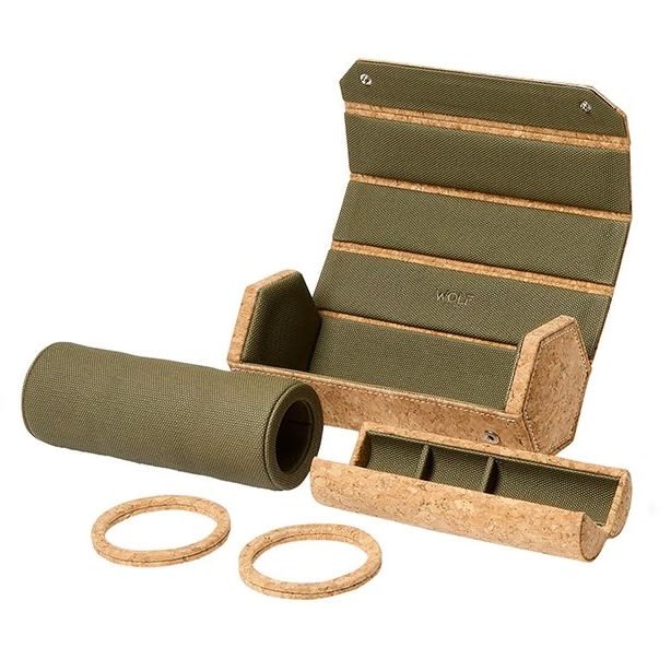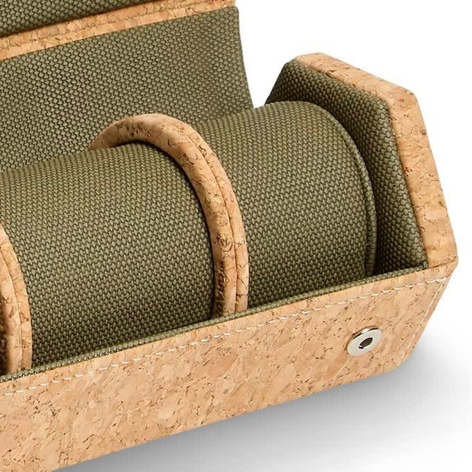 Inspired by the original box for a very special watch Cortiça is hand made from sustainably grown Portuguese cork. The watch roll’s unique hexagonal shape allows it to lay flat, displaying up to three watches against the khaki green interior. The watch roll simply fastens together for travel or to be stored neatly on a dresser.